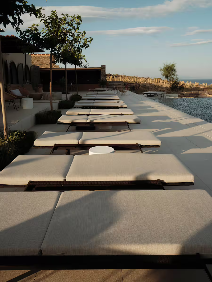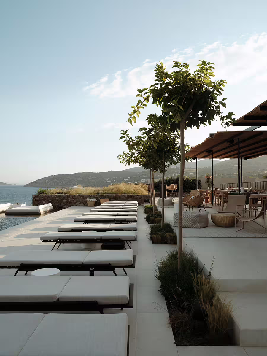 - NOS Junior Suite – Sea View with Plunge Pool (44 m²): Designed for relaxation and privacy, this suite features an open-plan living area, luxurious walk-in shower, and shaded terrace with breathtaking views over the Aegean and Chrysopigi Monastery. A secluded courtyard with private plunge pool and sunbeds offers the perfect retreat.