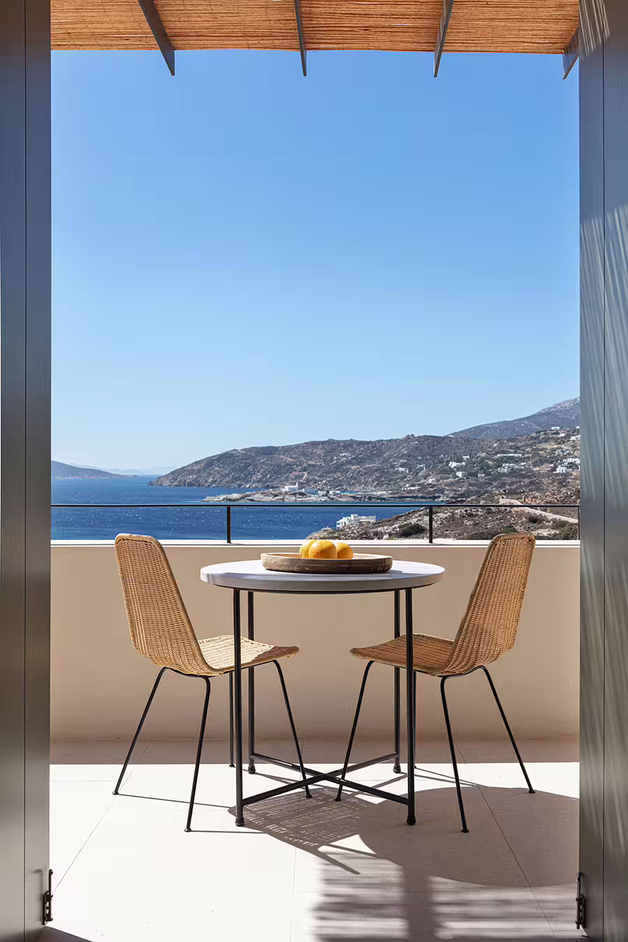 - FAROS The Superior – Sea View with Private Pool (37 m²): A spacious, light-filled suite with a private plunge pool, shaded verandas, and panoramic views of the Aegean, ideal for romantic seclusion and outdoor living.