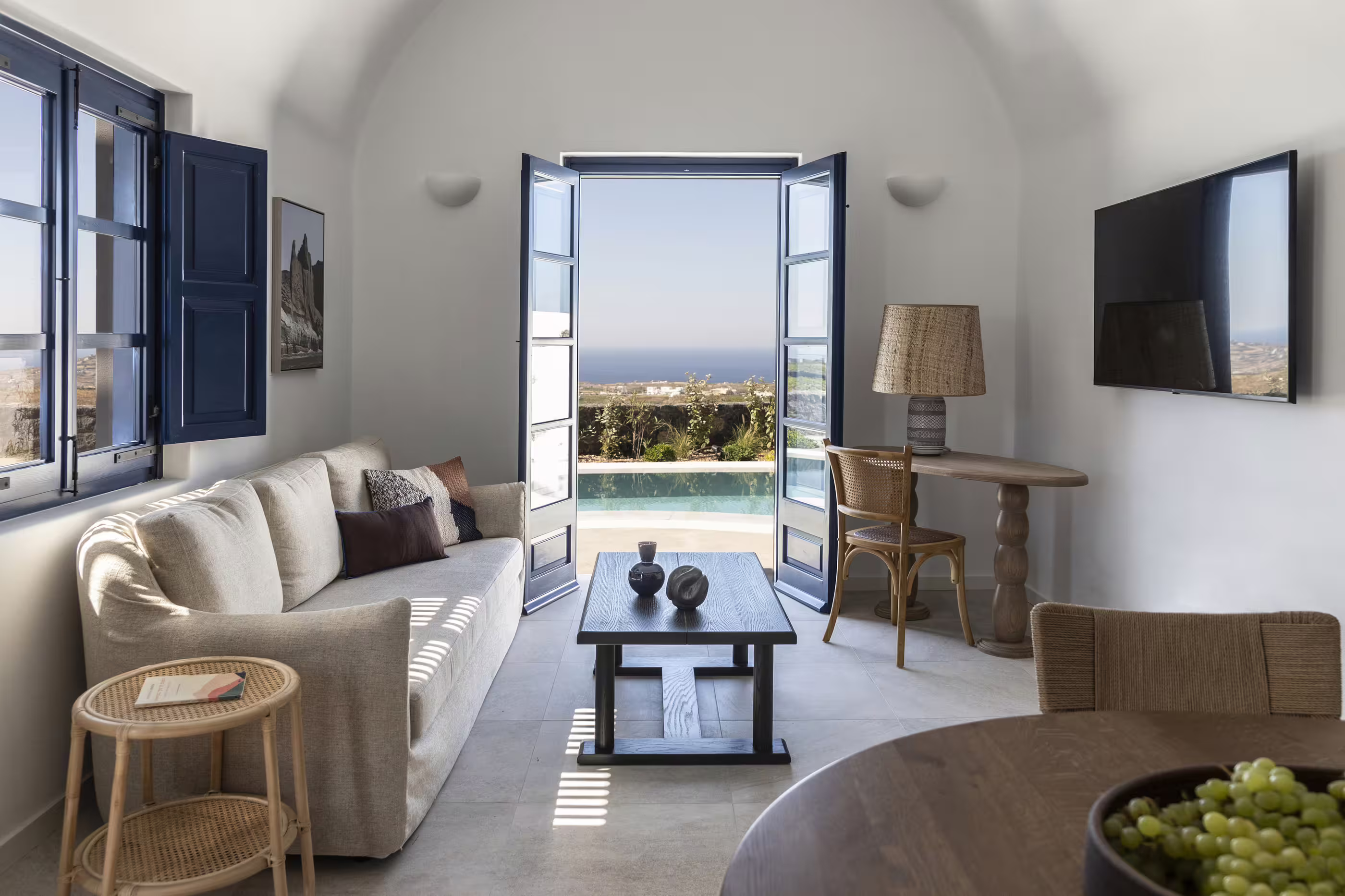 - Olympian Villa (75 m²) – One-bedroom villa, pool, outdoor Jacuzzi, living area, vineyard and sea views