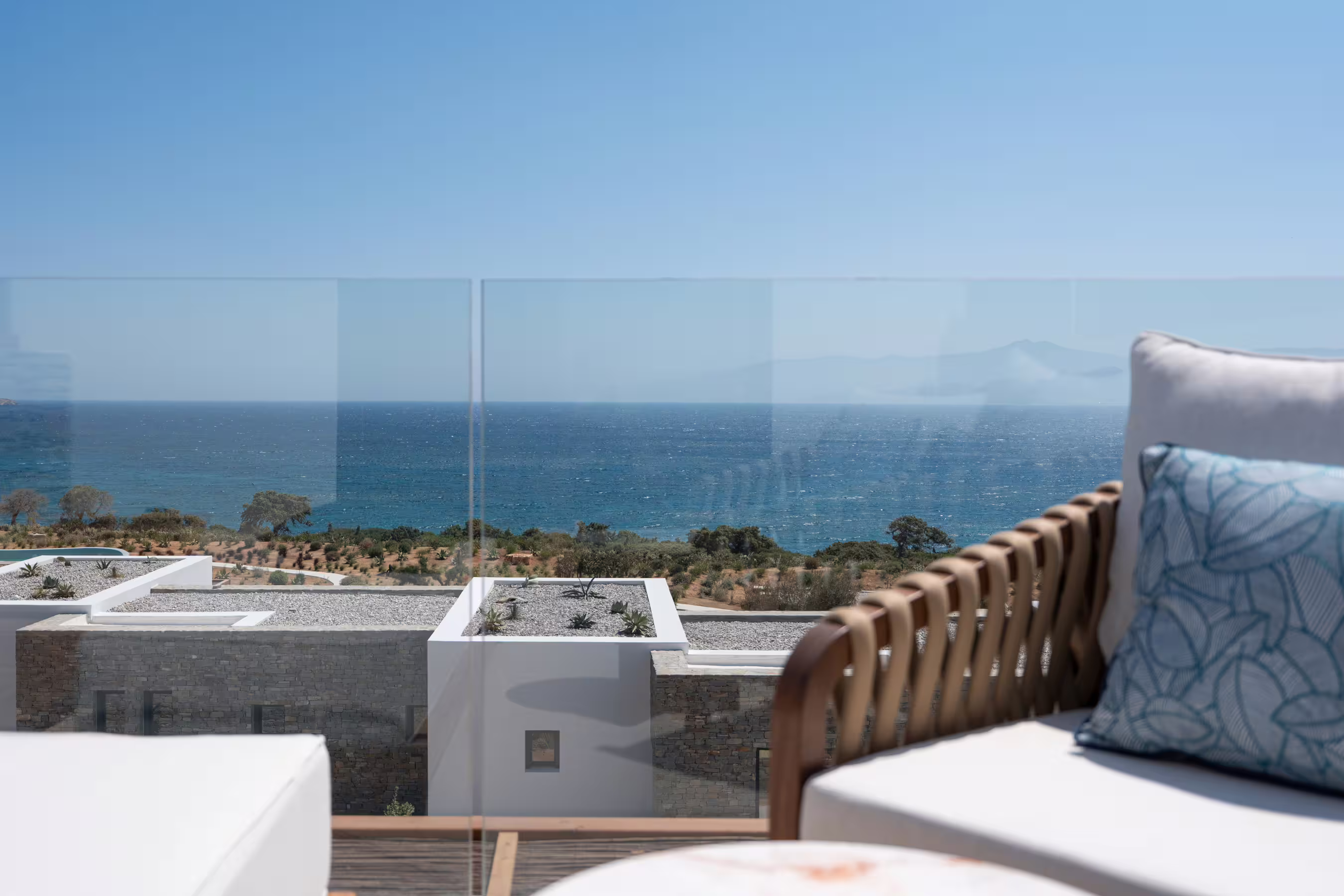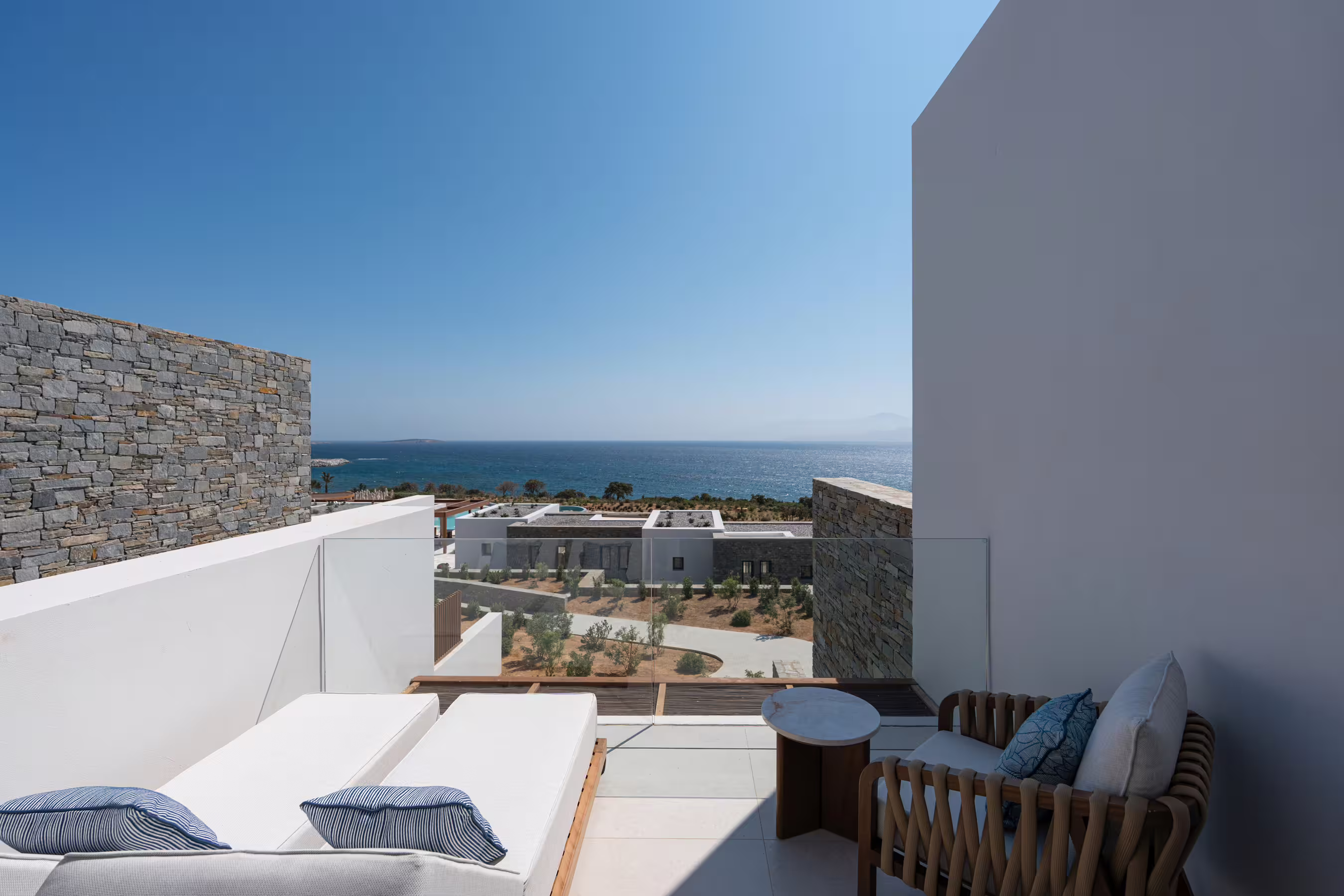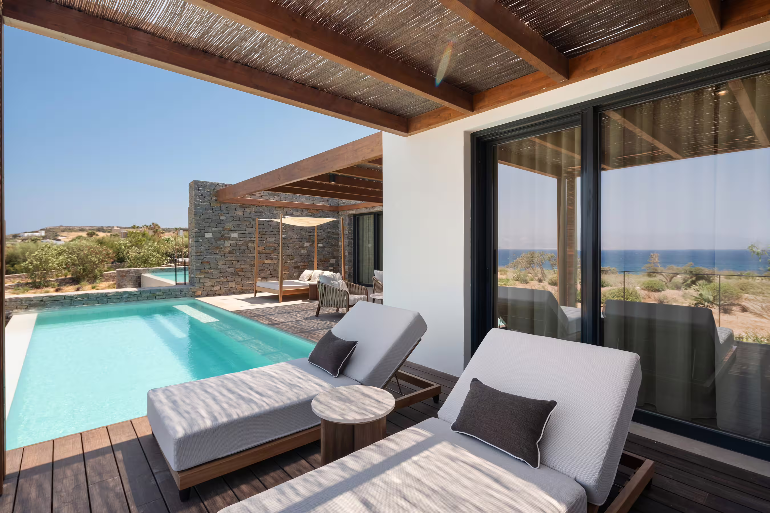 - Junior Suite with Private Pool – 32 m² ground-floor suite with private plunge pool (14 m² outdoor area), sea view, for 2 guests