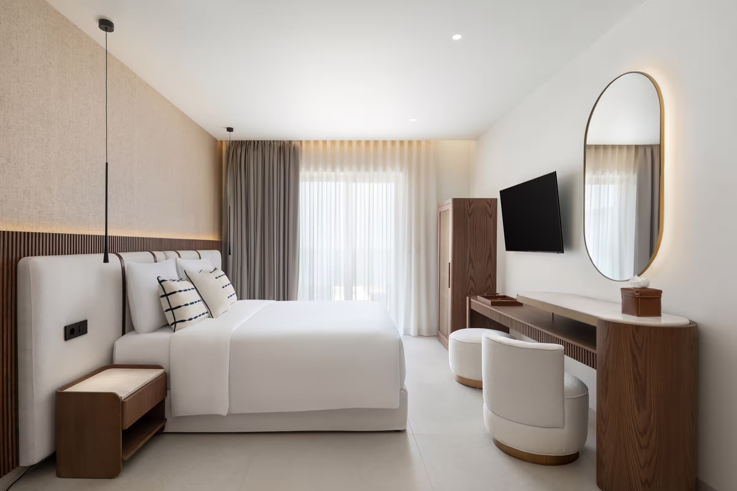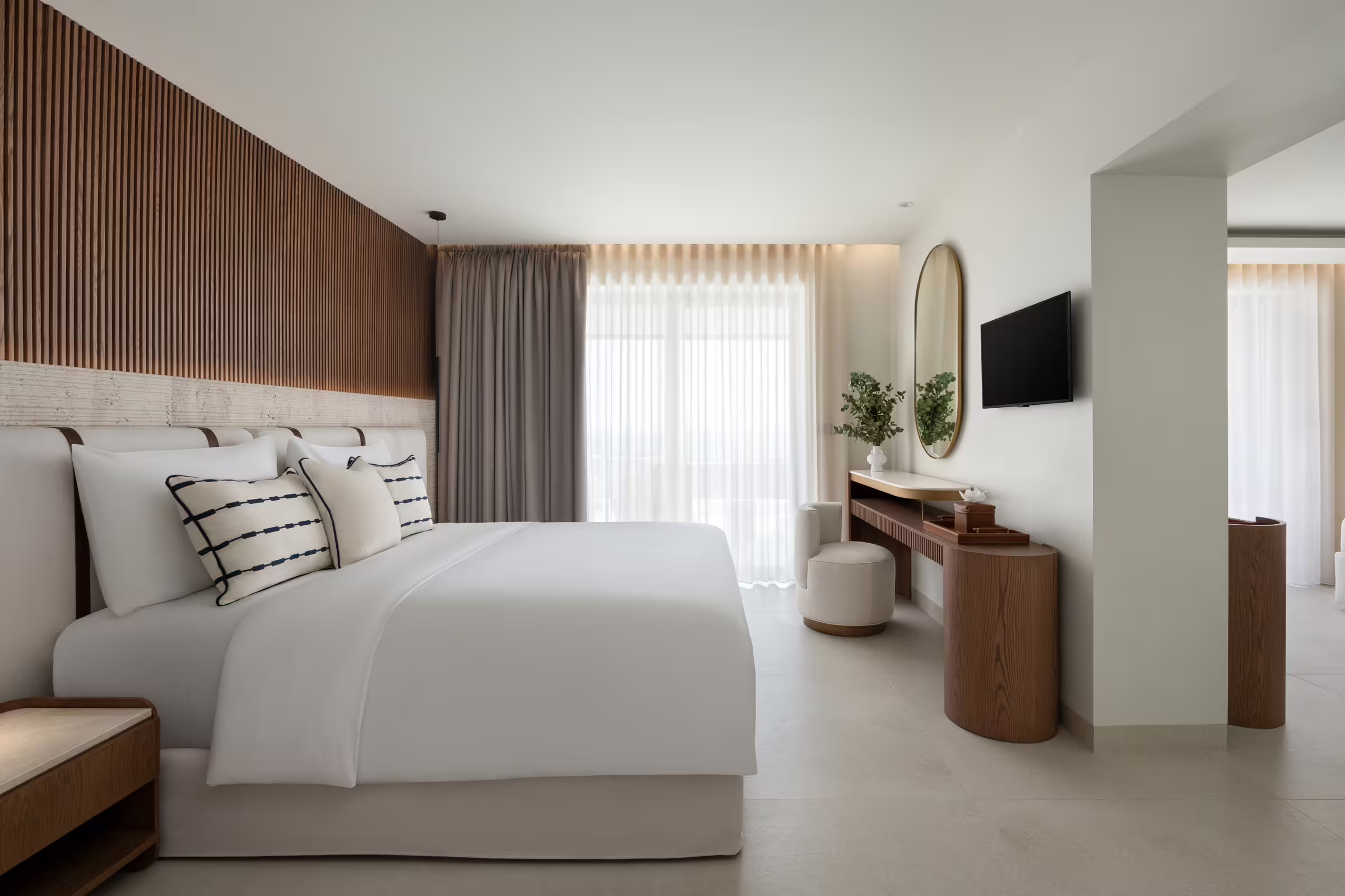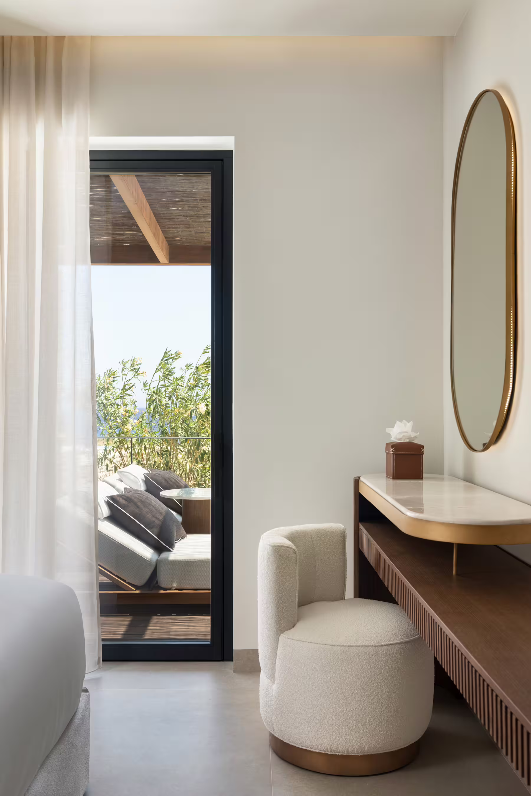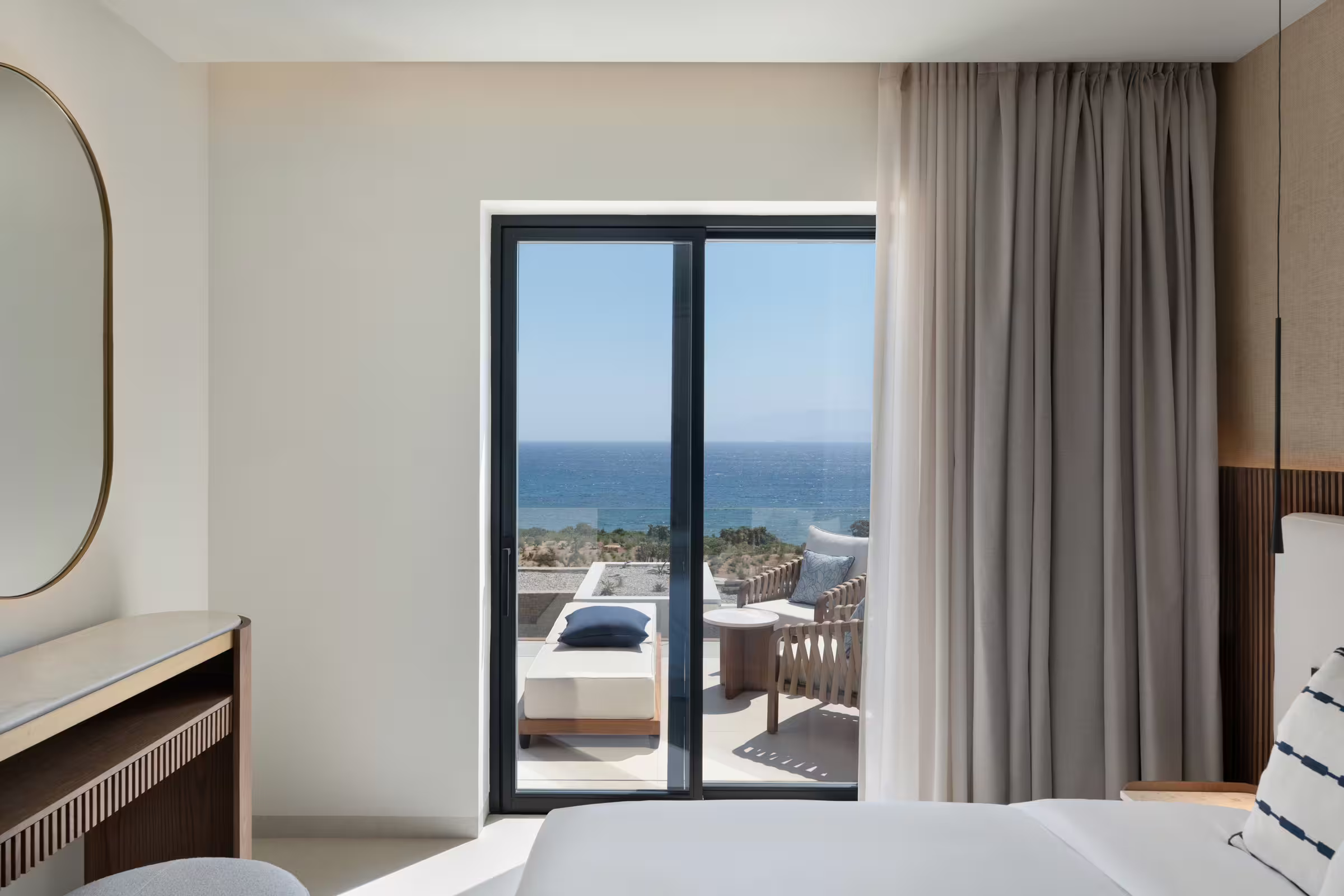 - Junior Suite with Private Pool – 32 m² ground-floor suite with private plunge pool (14 m² outdoor area), sea view, for 2 guests