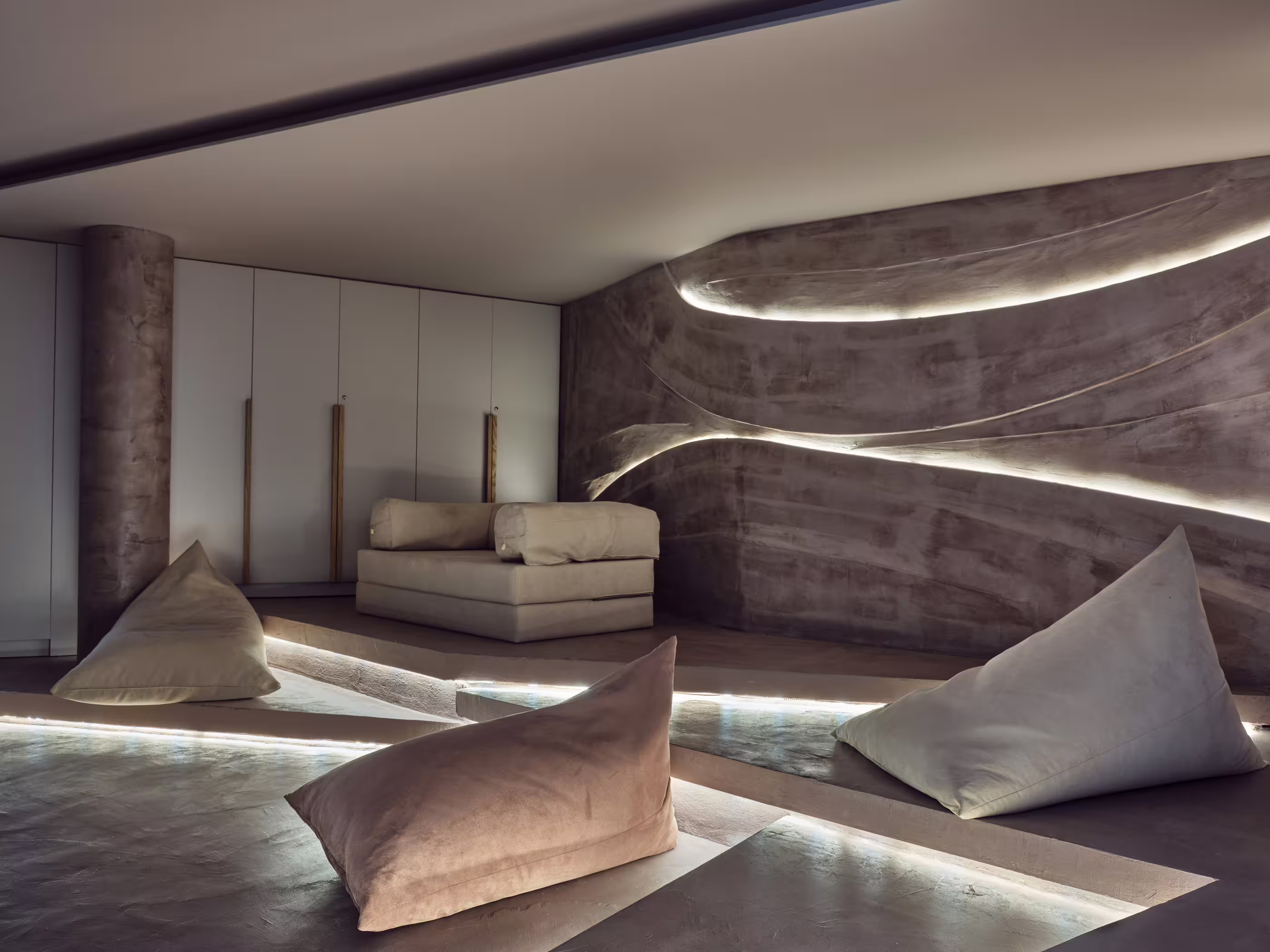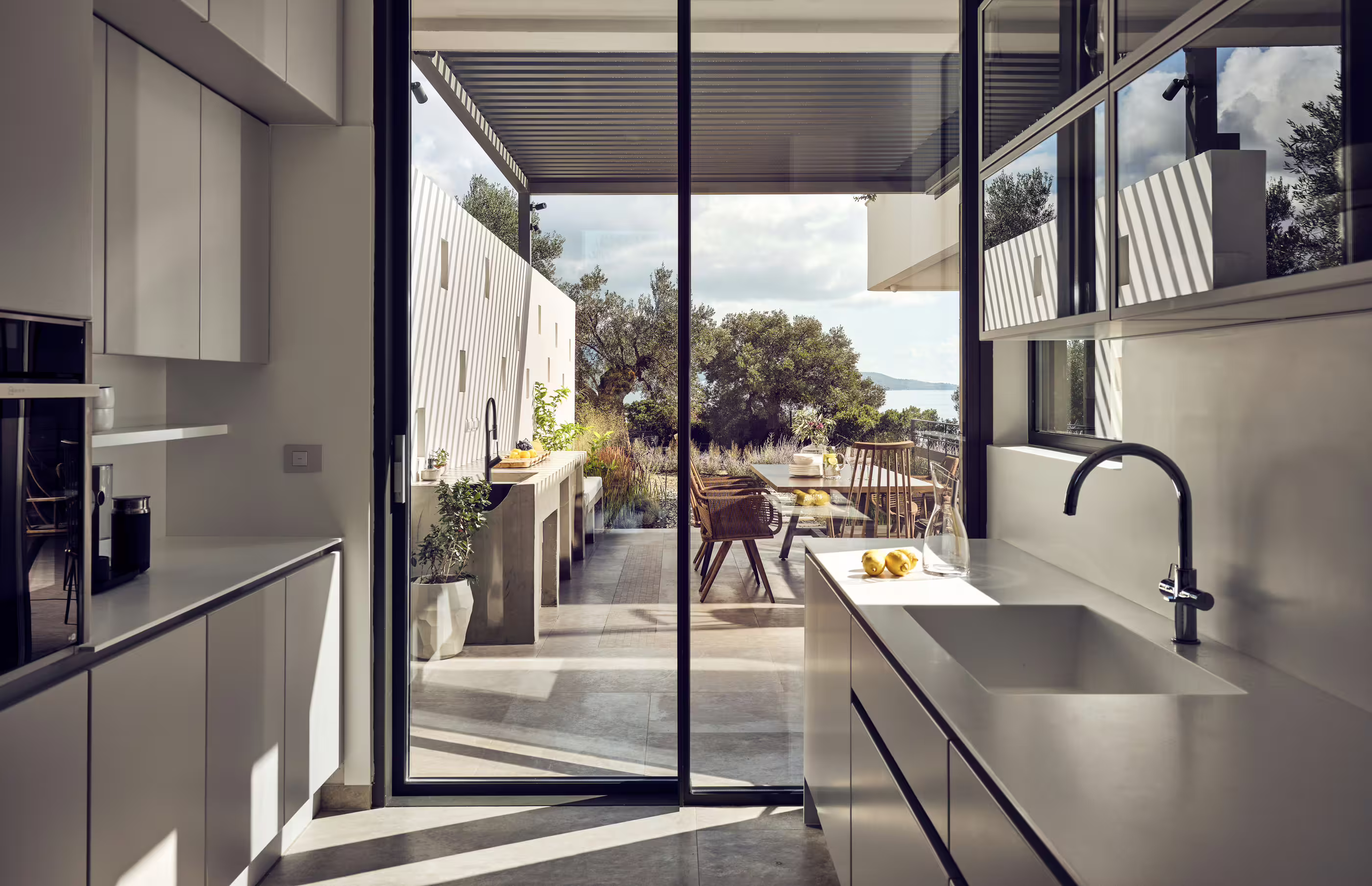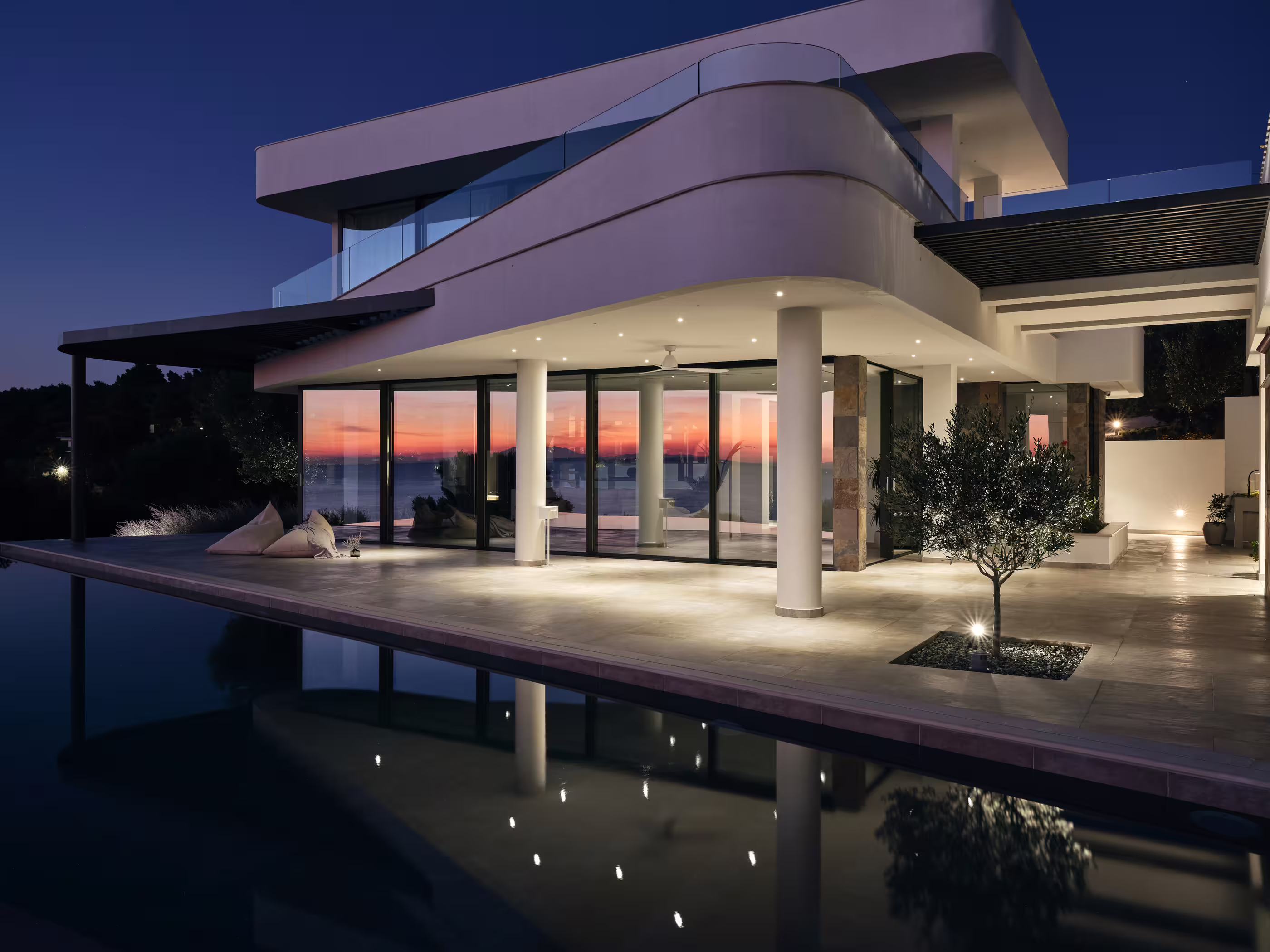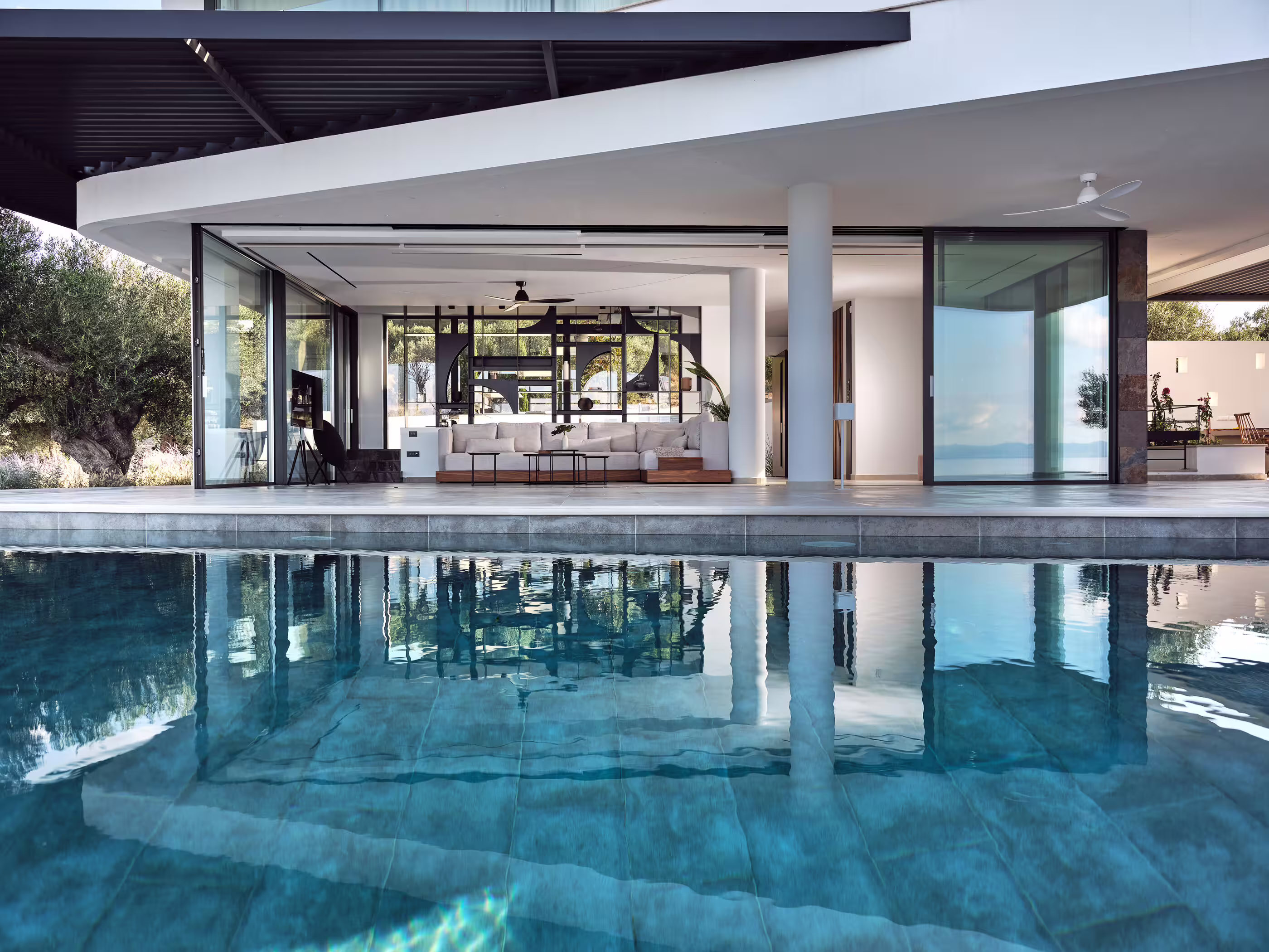 The villa is immersed in private gardens, surrounded by olive trees, Mediterranean plants, and herbs. Highlights include multiple lounge areas for relaxing and admiring the sunset behind Mount Olympus. The roof garden offers a breathtaking 360° view, complete with a sofa bed for stargazing. Outdoor spaces include a poolside living room, fireplace lounge, and a cozy swing corner.