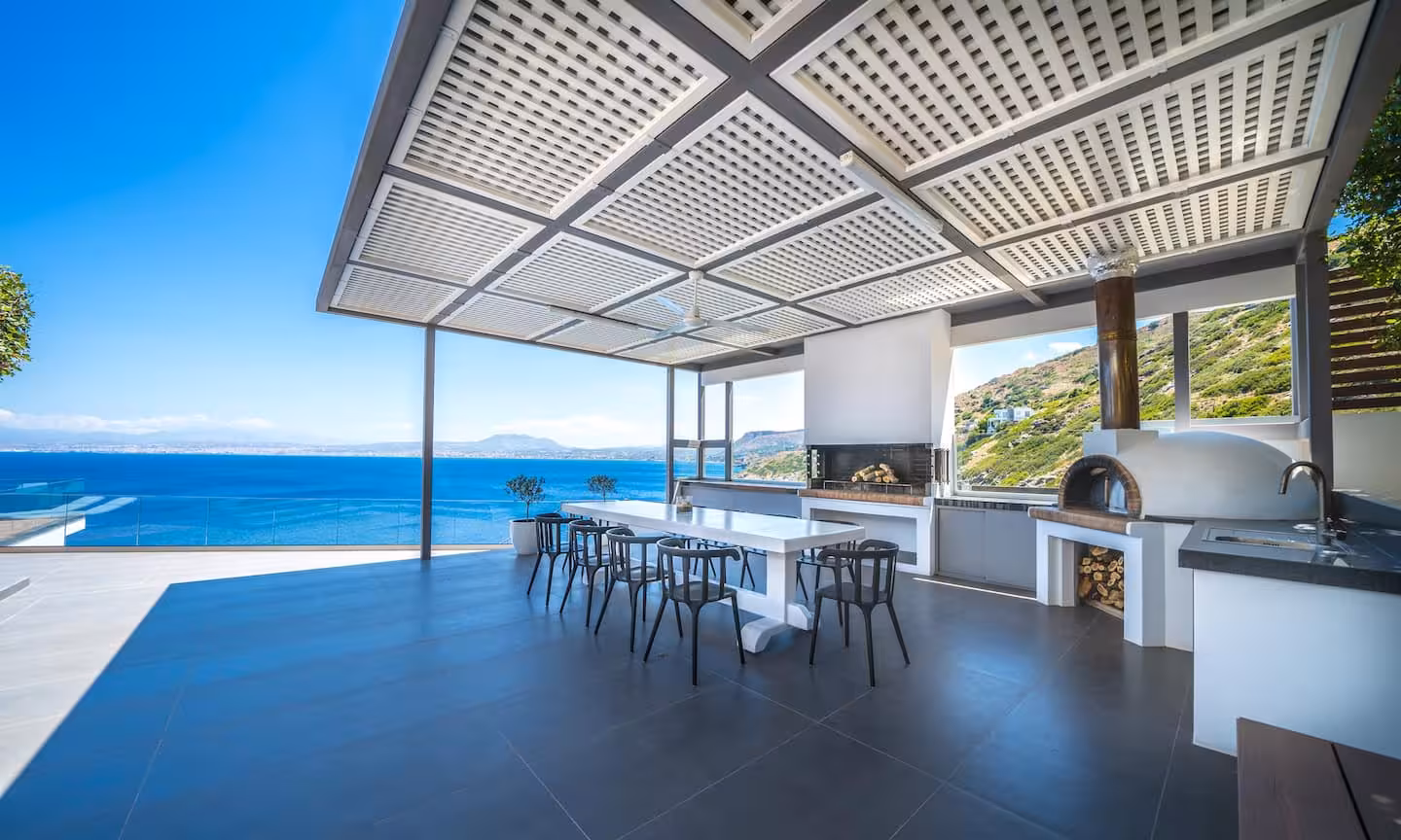 - Living area with comfortable leather sofas, fireplace, 55″ Smart TV and floor-to-ceiling windows, direct access to pool, sea and the city of Heraklion views