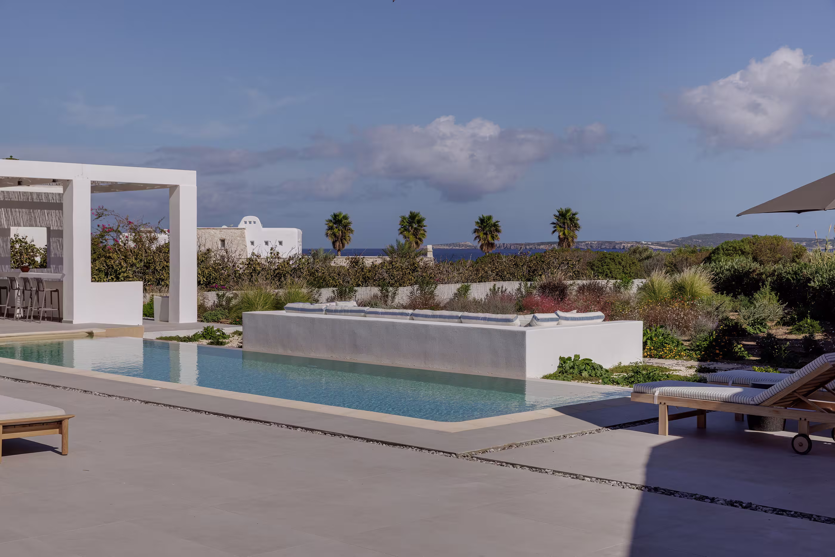 Outdoors, the villa is thoughtfully arranged for elevated leisure and entertaining. A private swimming pool is complemented by a stylish sunken lounge, poolside relaxation areas, and multiple shaded dining spaces, along with a dedicated barbecue zone ideal for long, convivial meals. With its hillside setting, modern comforts, and serene surroundings, Villa Satori offers a sophisticated escape for guests seeking privacy, design, and proximity to one of Paros’ most vibrant destinations.