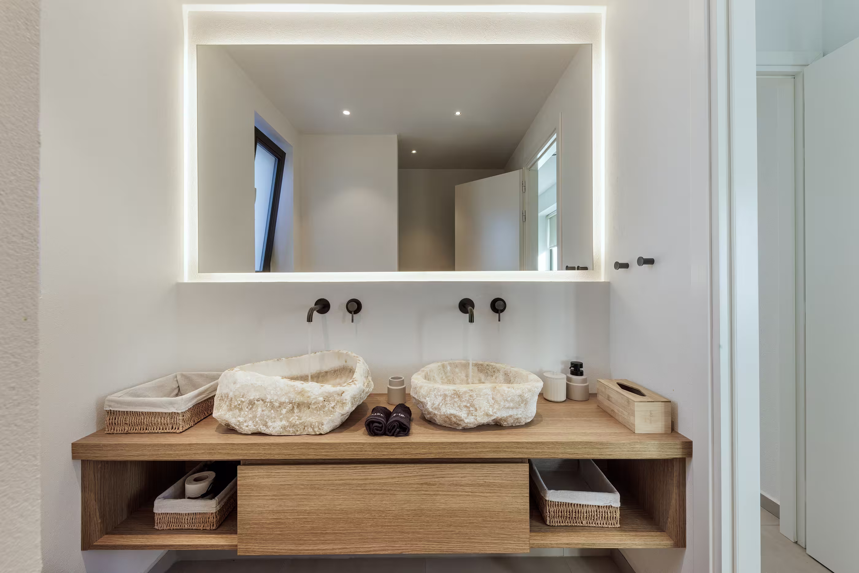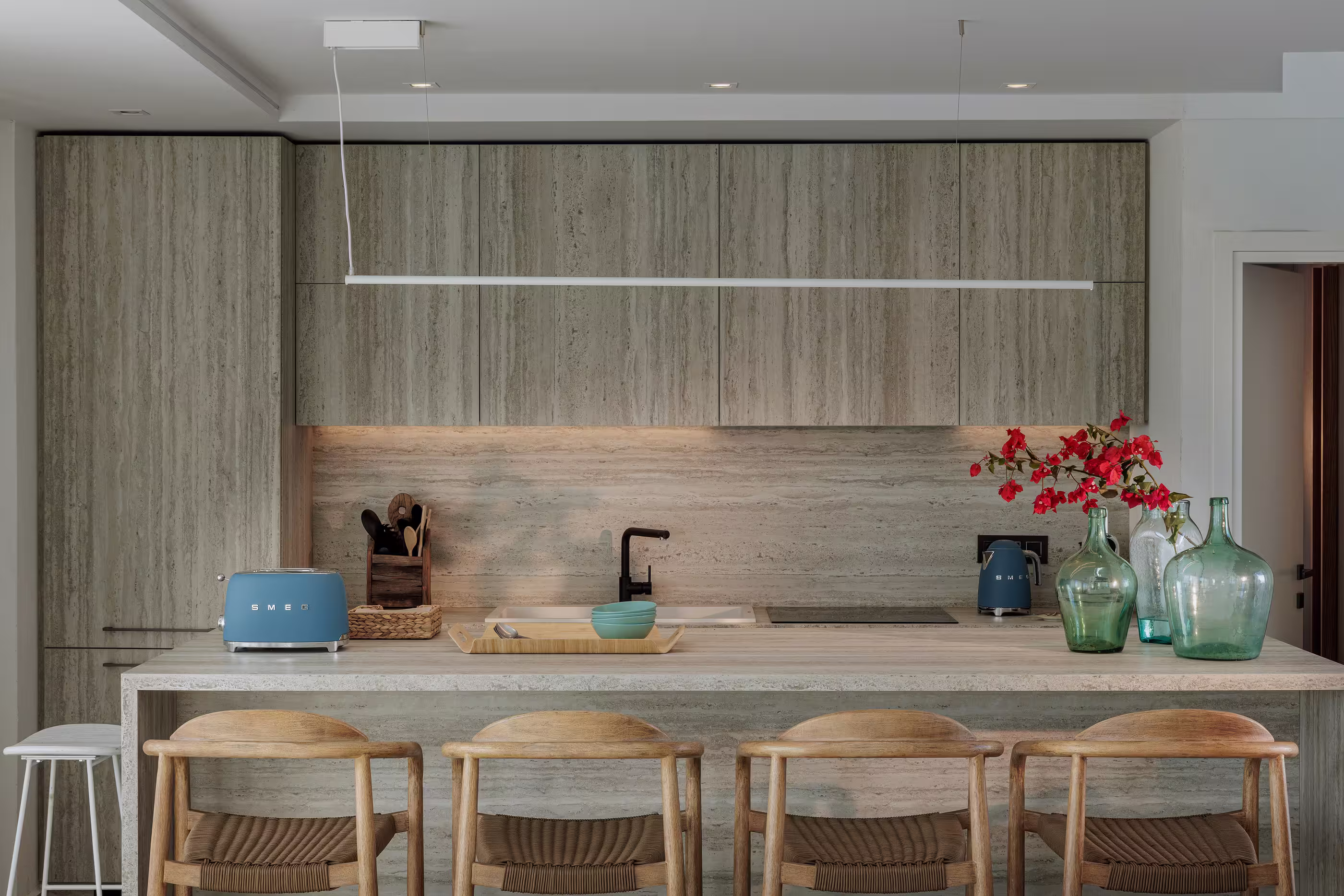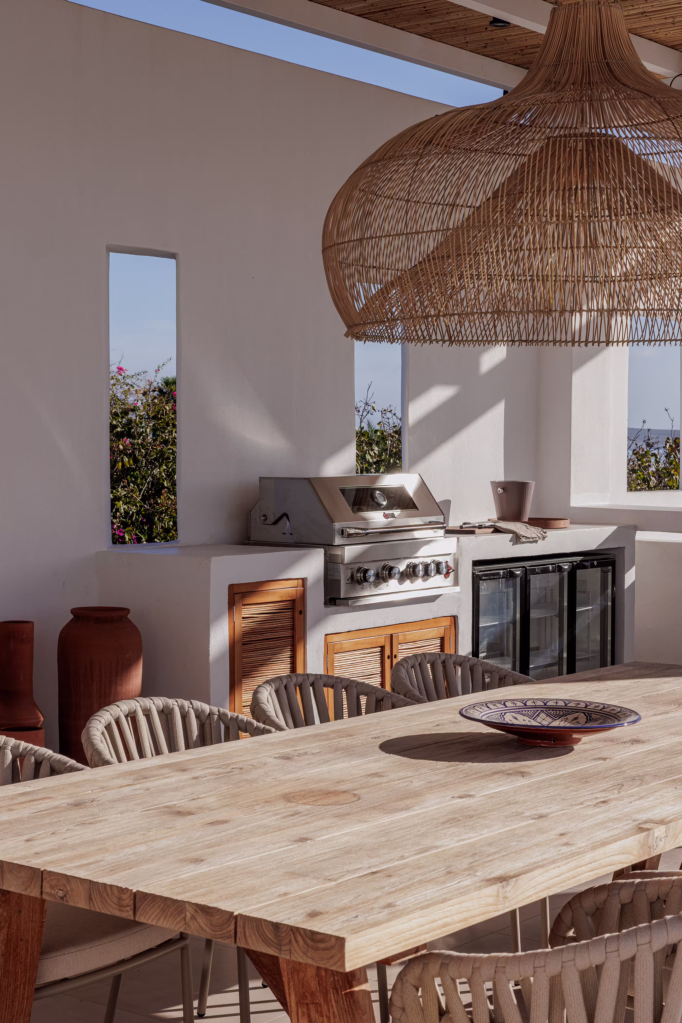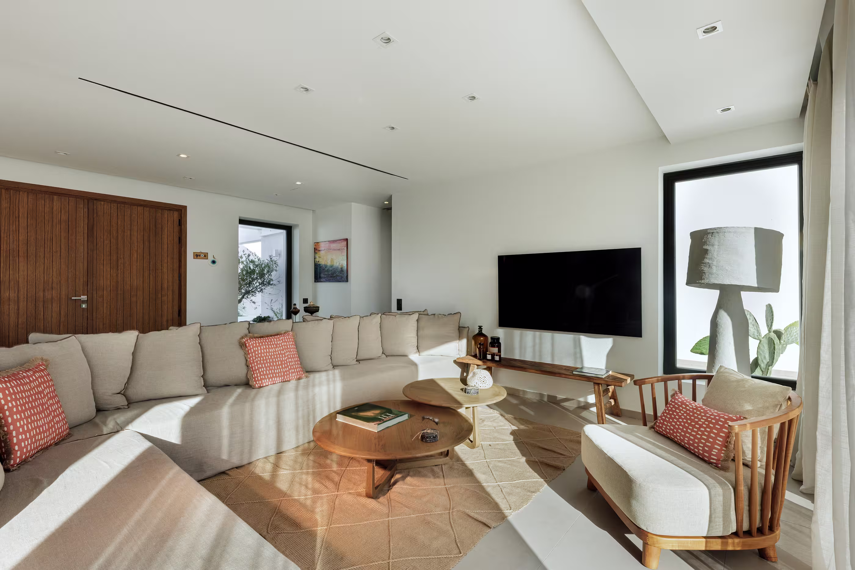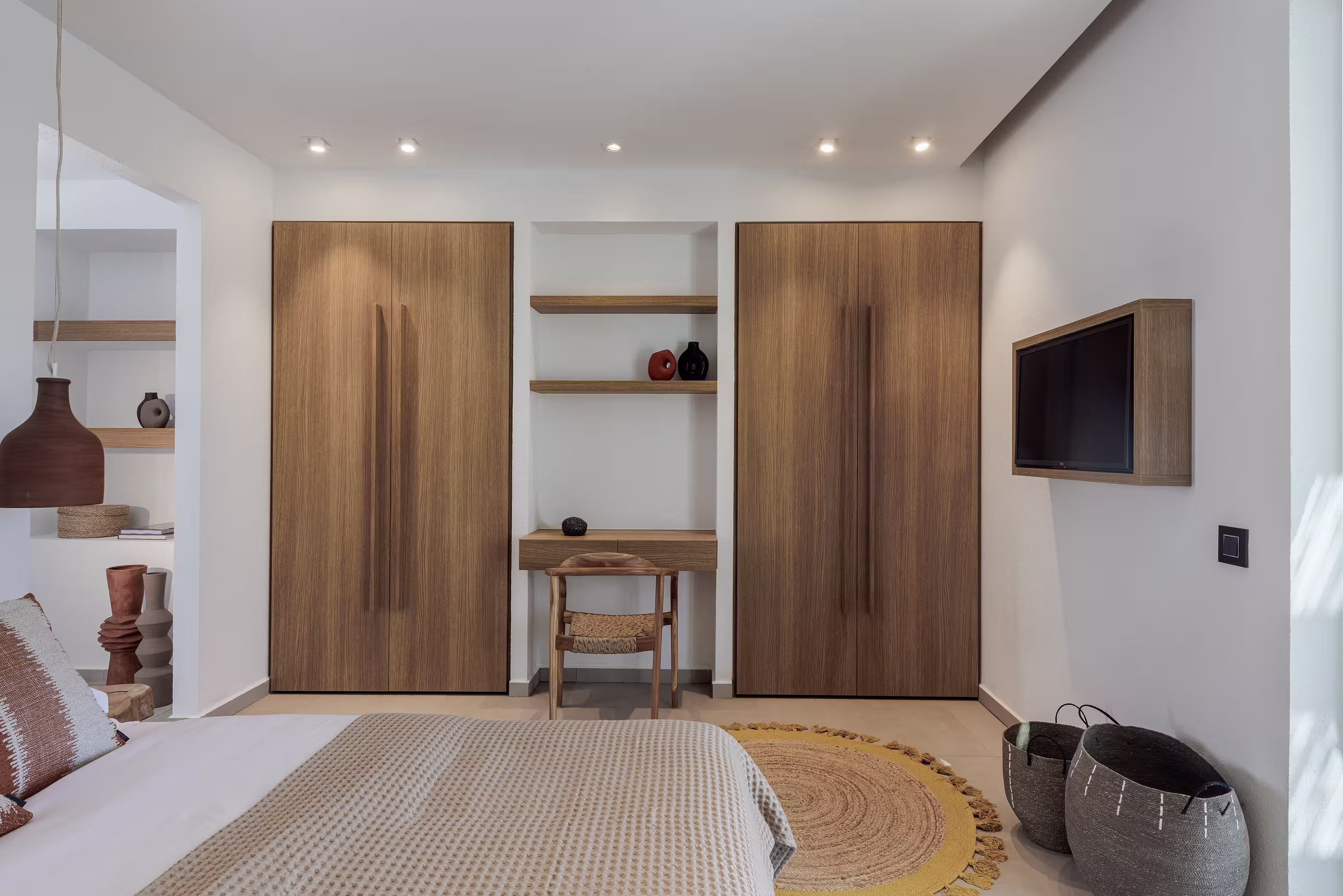 Warm natural interiors blending Cycladic architecture with contemporary comfort.