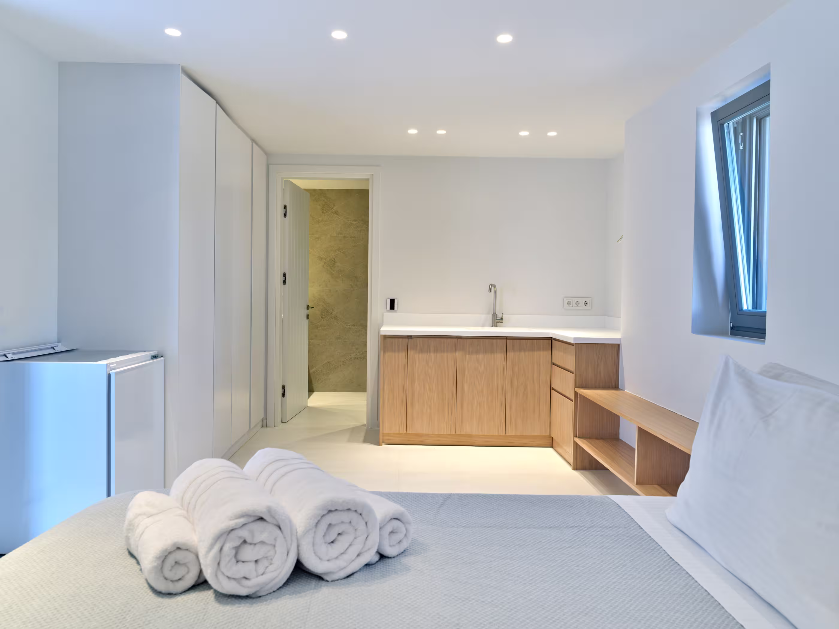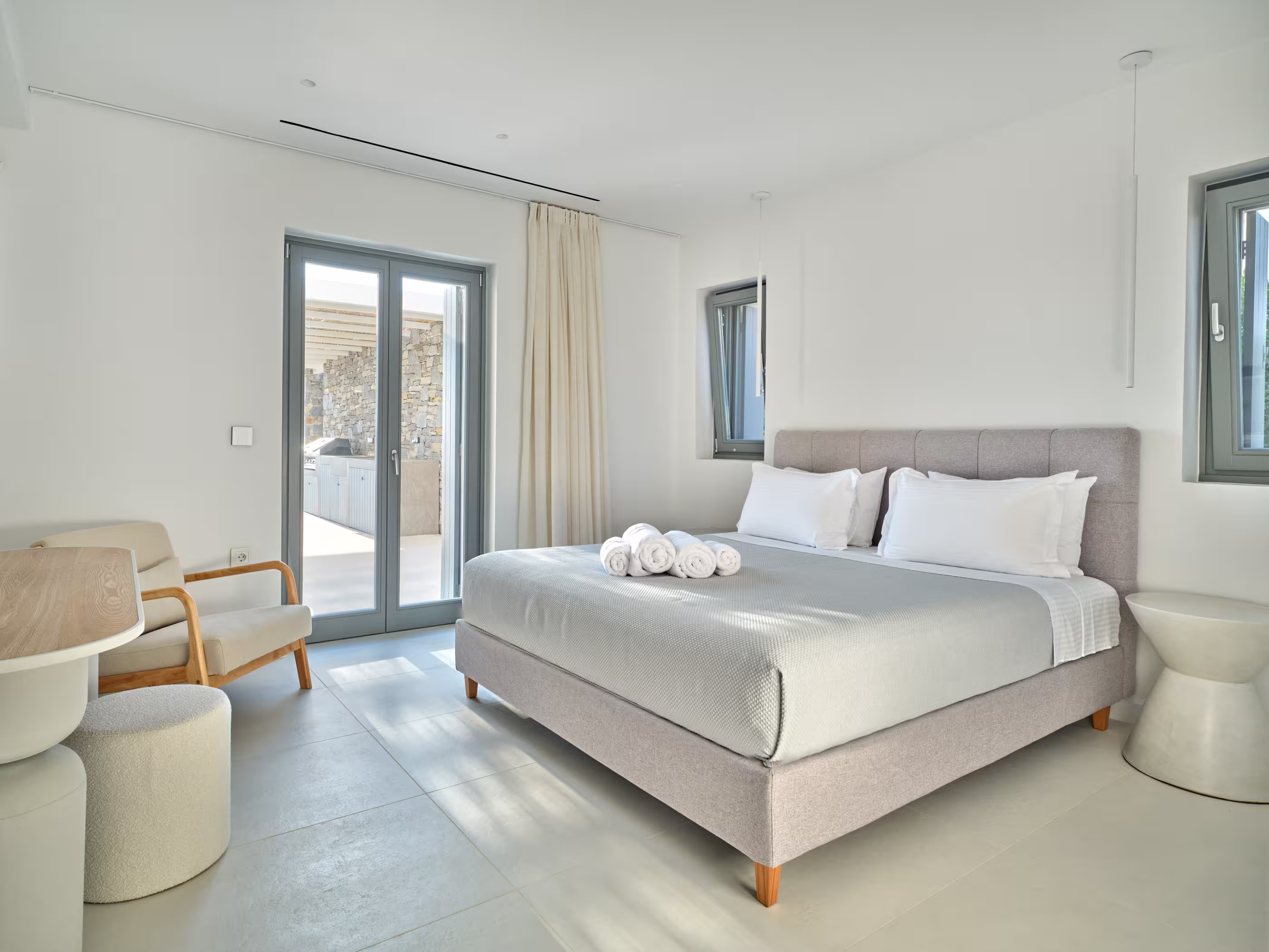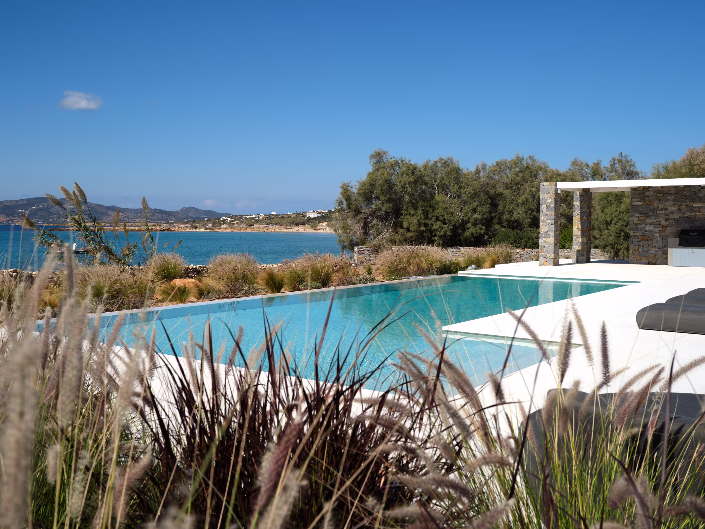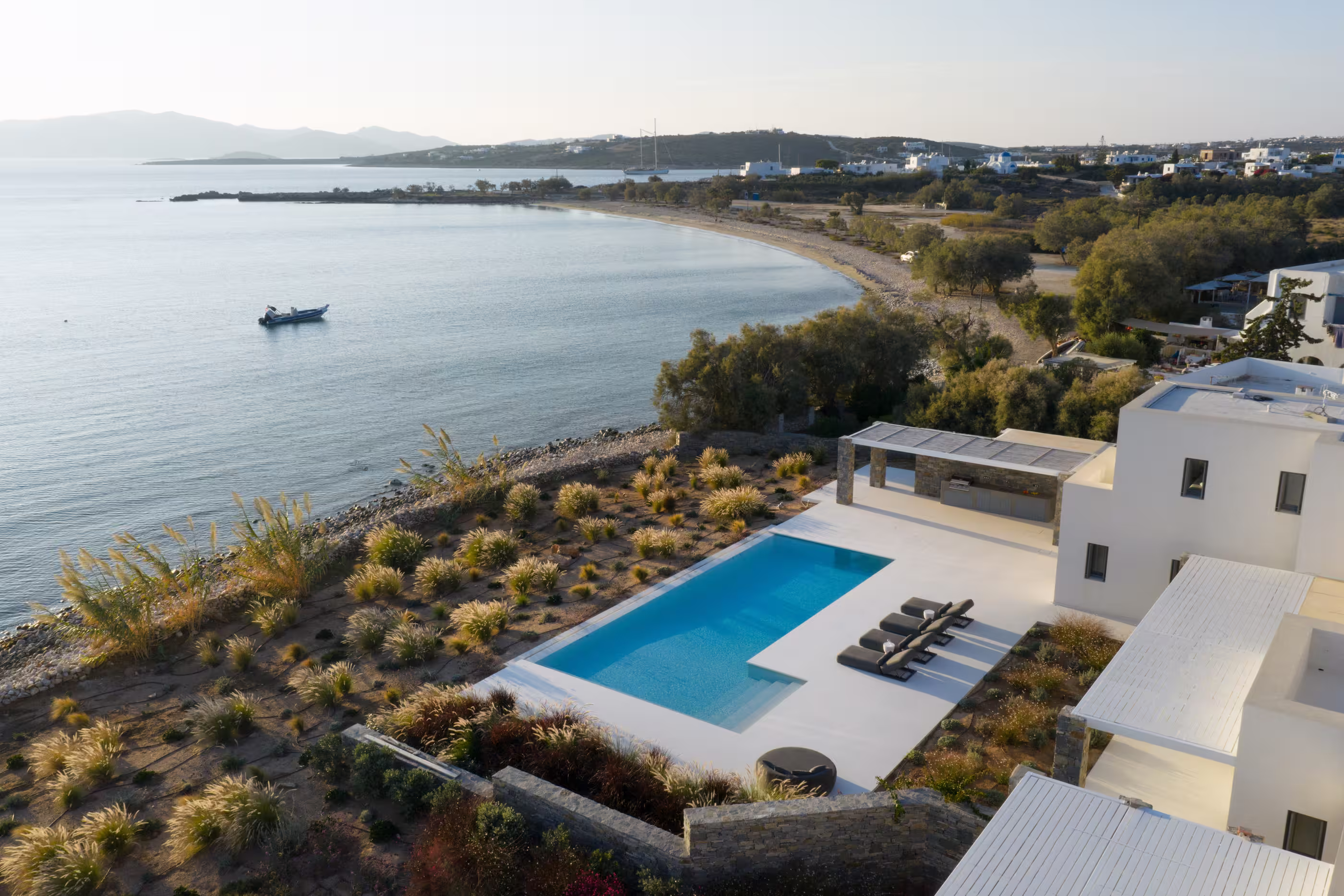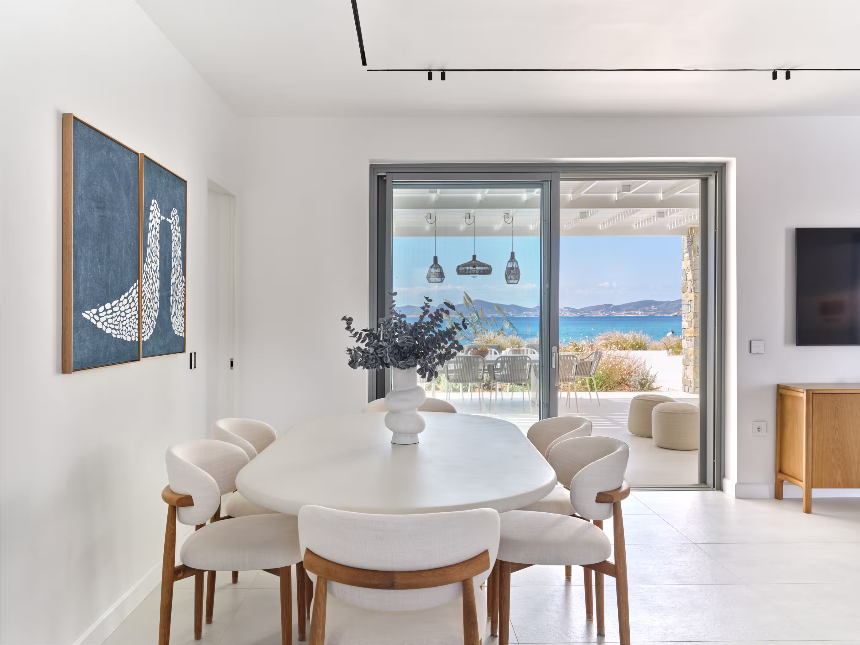 Outdoors, guests can unwind by the private swimming pool, lounge on sunbeds, or enjoy alfresco dining in the shaded living areas, all while overlooking the Aegean. With direct beach access, modern amenities, and a peaceful seafront setting, the villa is ideal for families or small groups seeking a stylish yet relaxed retreat in one of Paros’ most sought-after coastal locations.