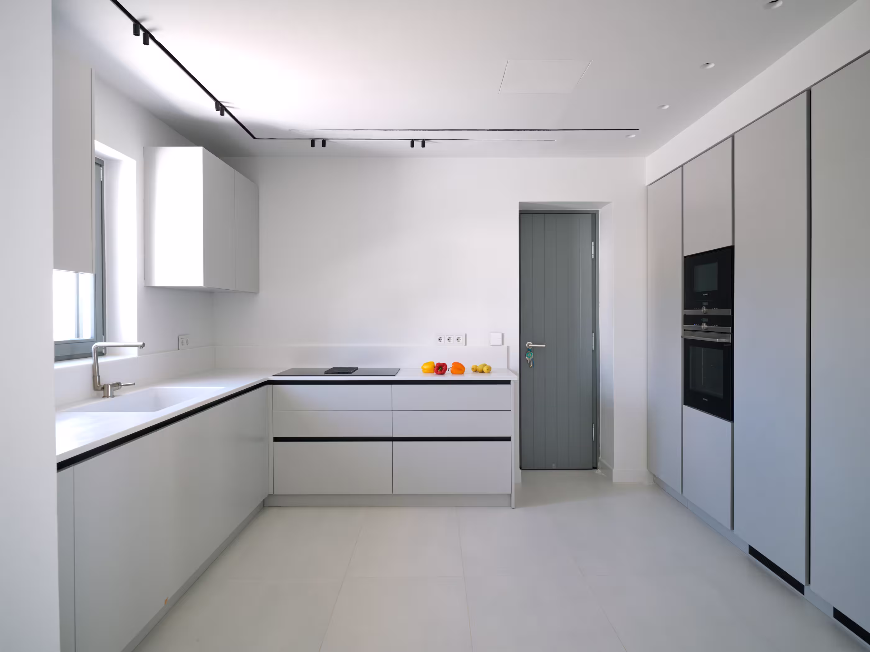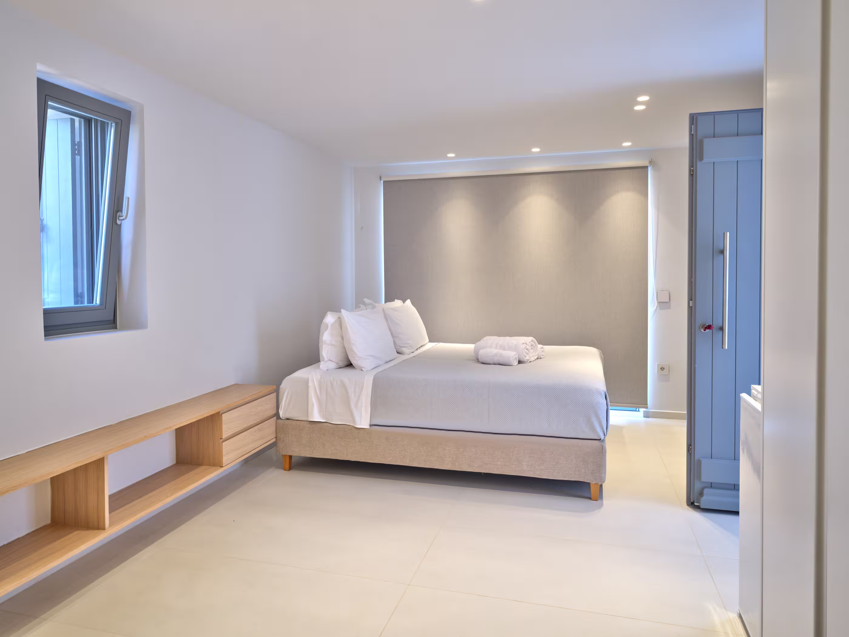 Spanning approximately 300 sqm, the villa accommodates up to 12 guests across five spacious en-suite bedrooms, complemented by an additional guest or staff bedroom with independent access. Interiors are bright and contemporary, featuring an open-plan living and dining area, a fully equipped kitchen, and seamless indoor-outdoor flow.