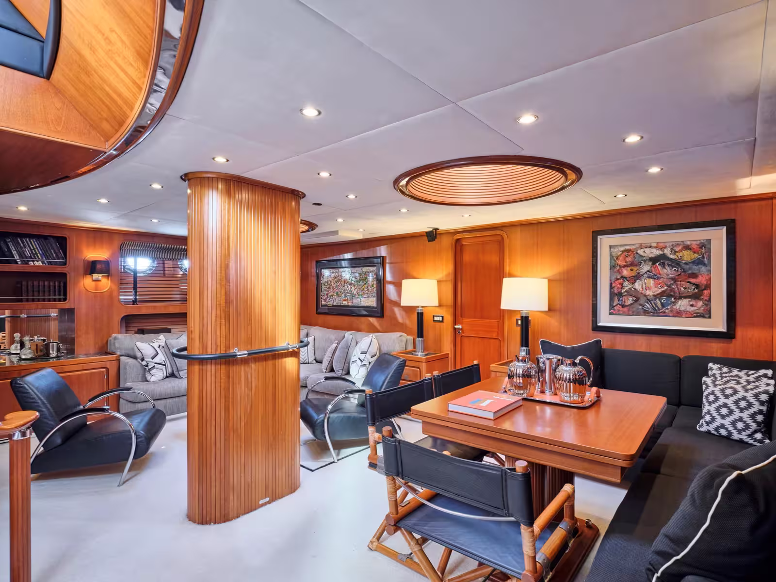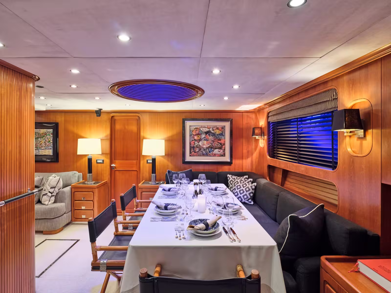 Cockpit designed to welcome up to 50 for cocktails or 12 for seated dining, ideal for gatherings at sea.