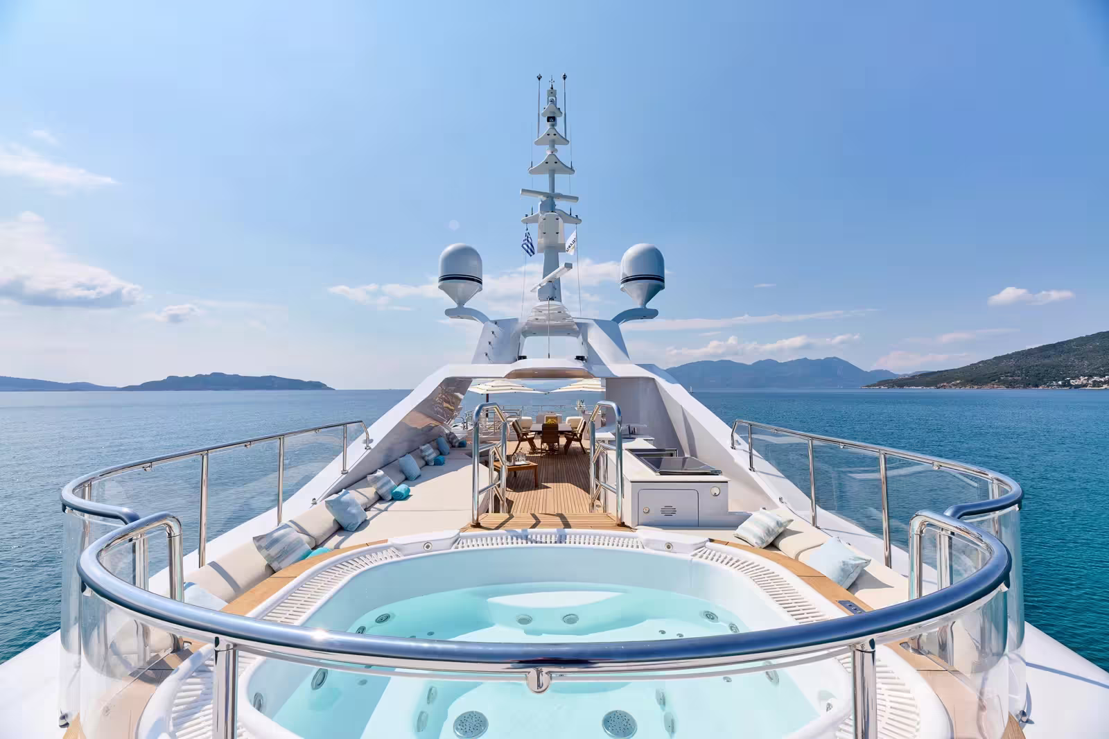 - Sun Deck: Expansive area featuring a Jacuzzi/spa pool, sun loungers and sun‑pads, a bar and shaded seating