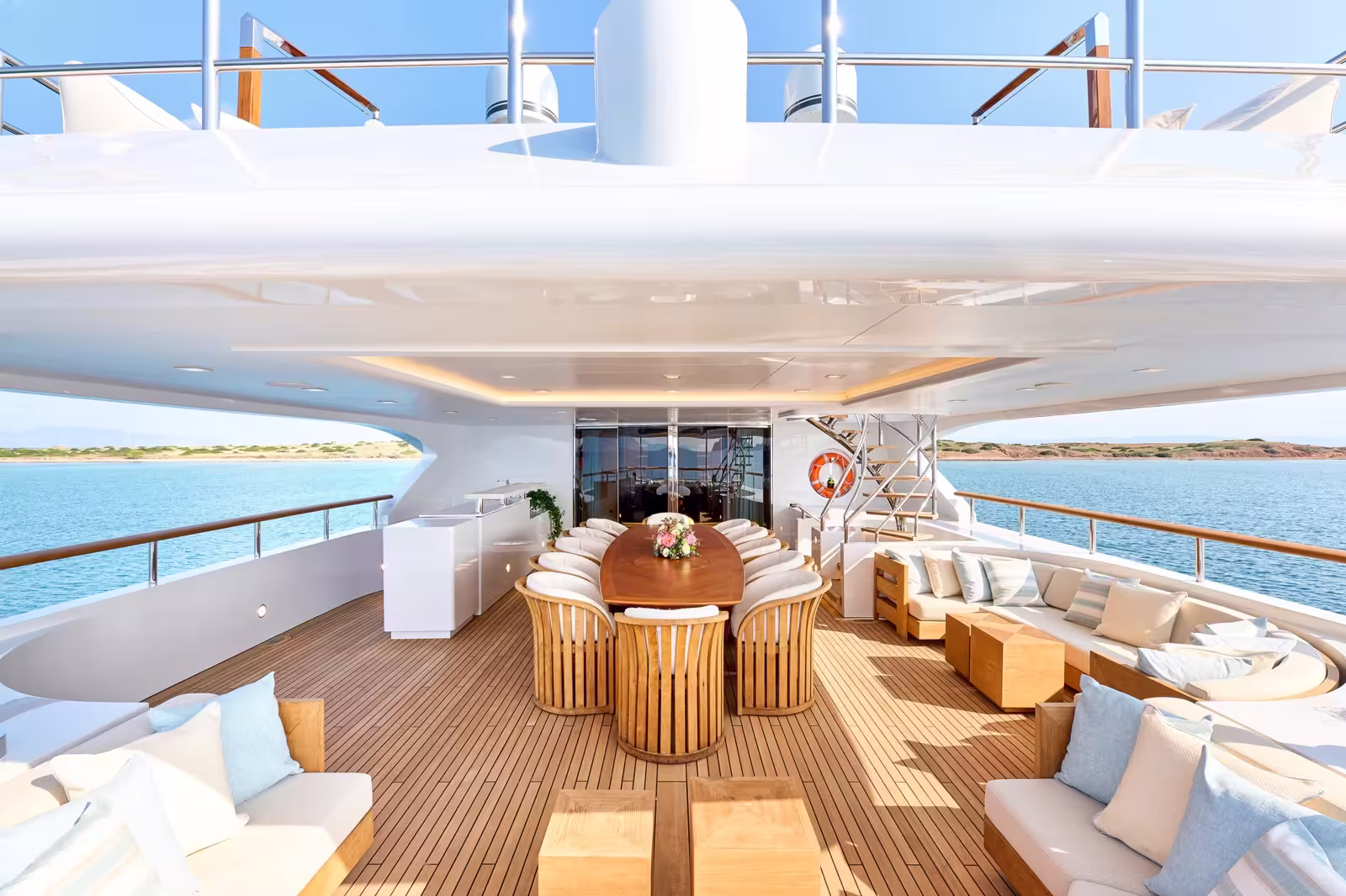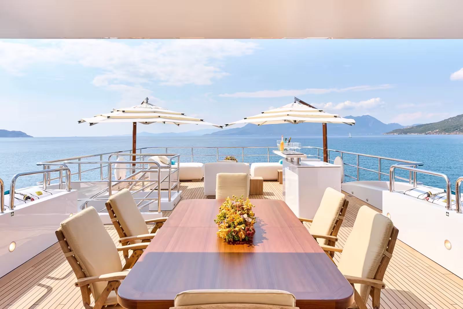 - Upper Deck Aft: Alfresco dining space with a polished wooden table, comfortable seating and a wet bar