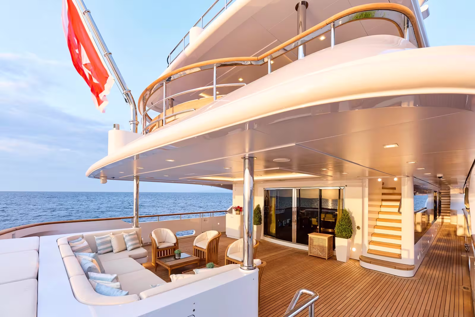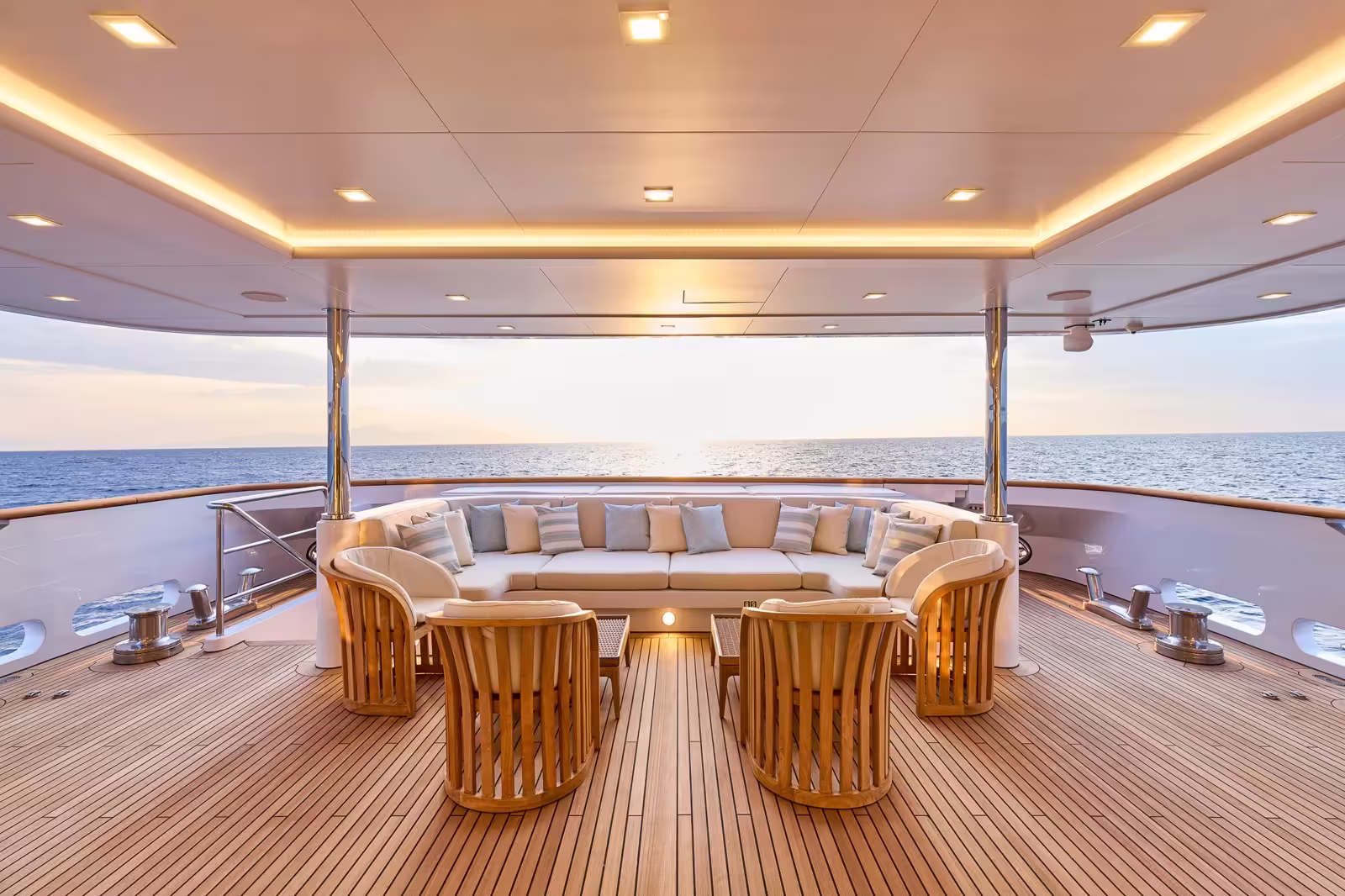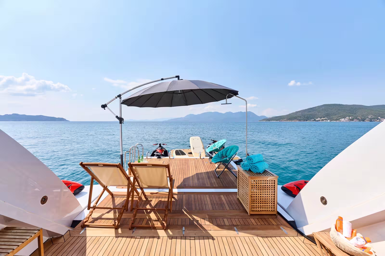 - Main Deck Aft: Relaxed lounge seating connecting directly to the main salon, offering both casual lounging and convenient access to the water via the transom.