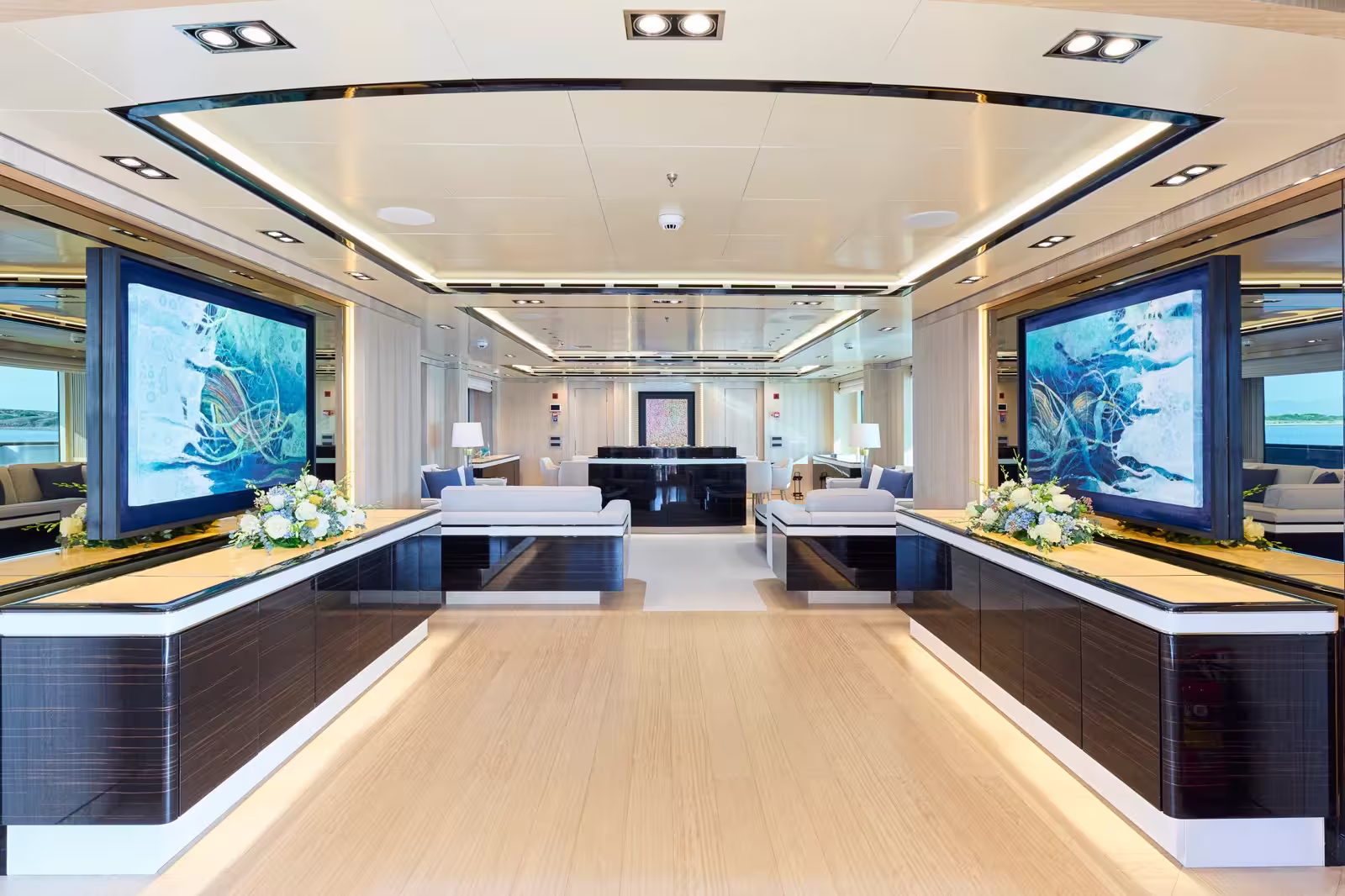 Double‑salon architecture with panoramic windows, elegant main salon plus an intimate upper‑deck lounge, both flooded with natural light and offering spectacular sea views.