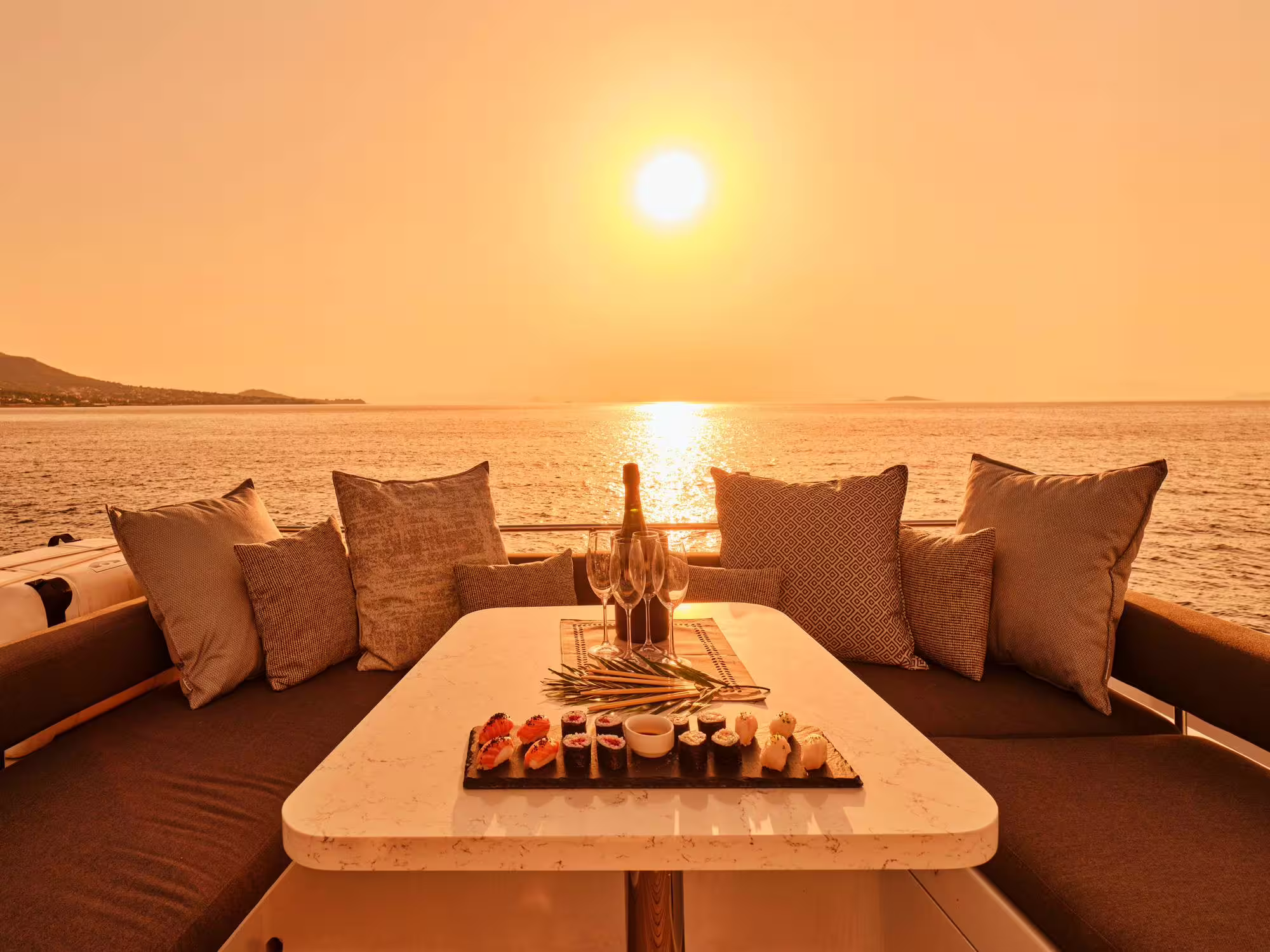 - Flybridge: Dining area, Wet bar, BBQ, and sunloungers