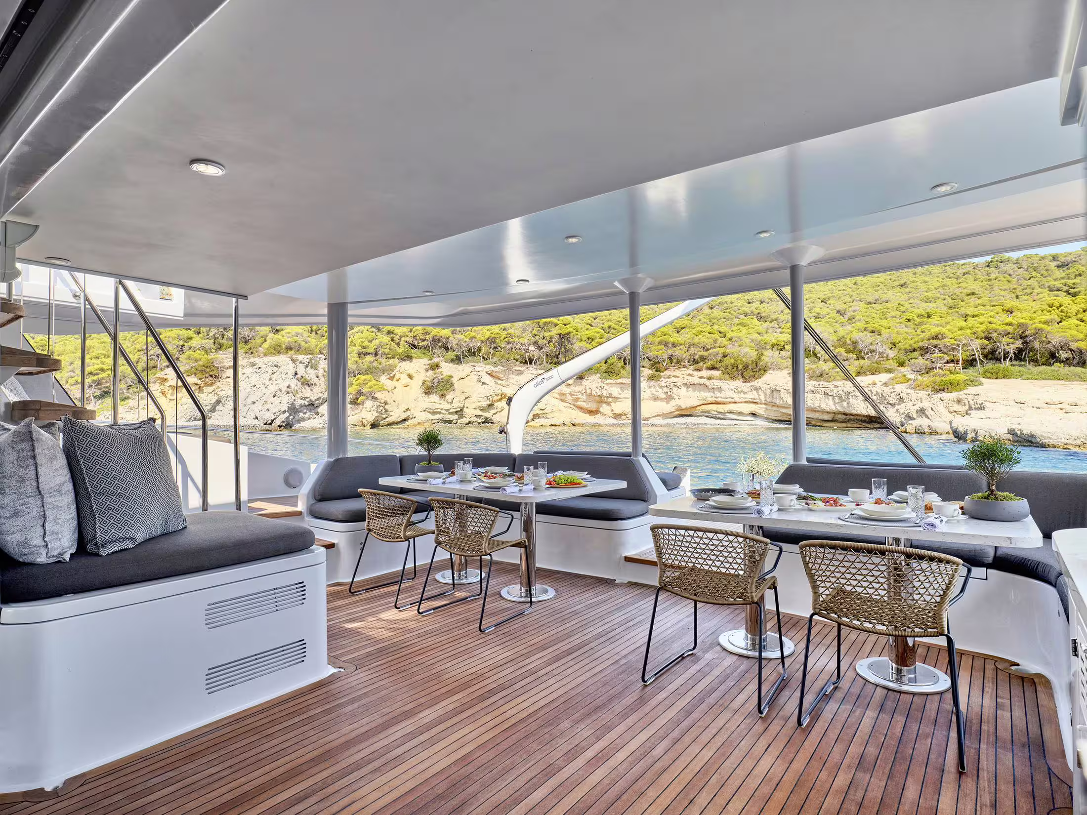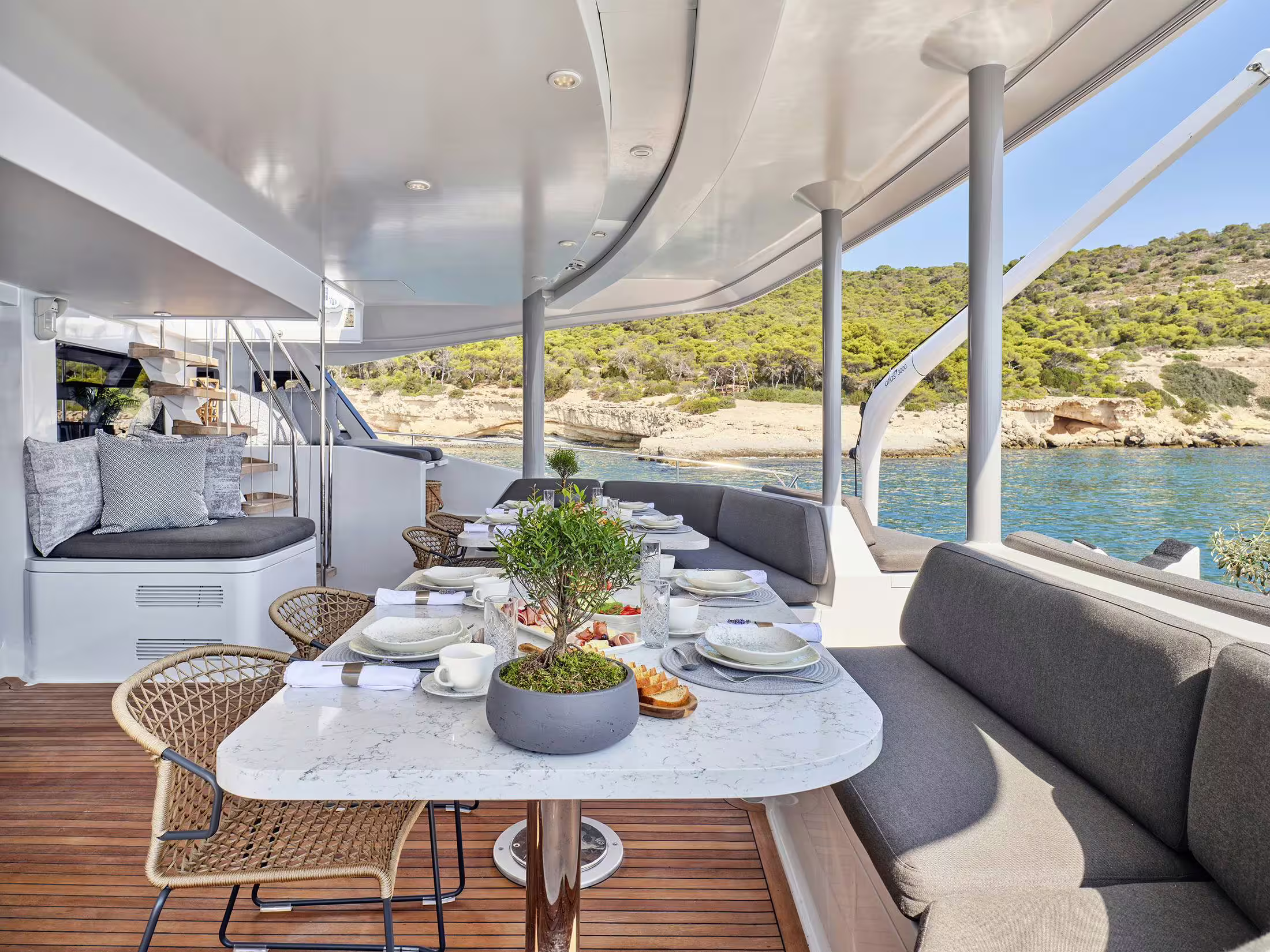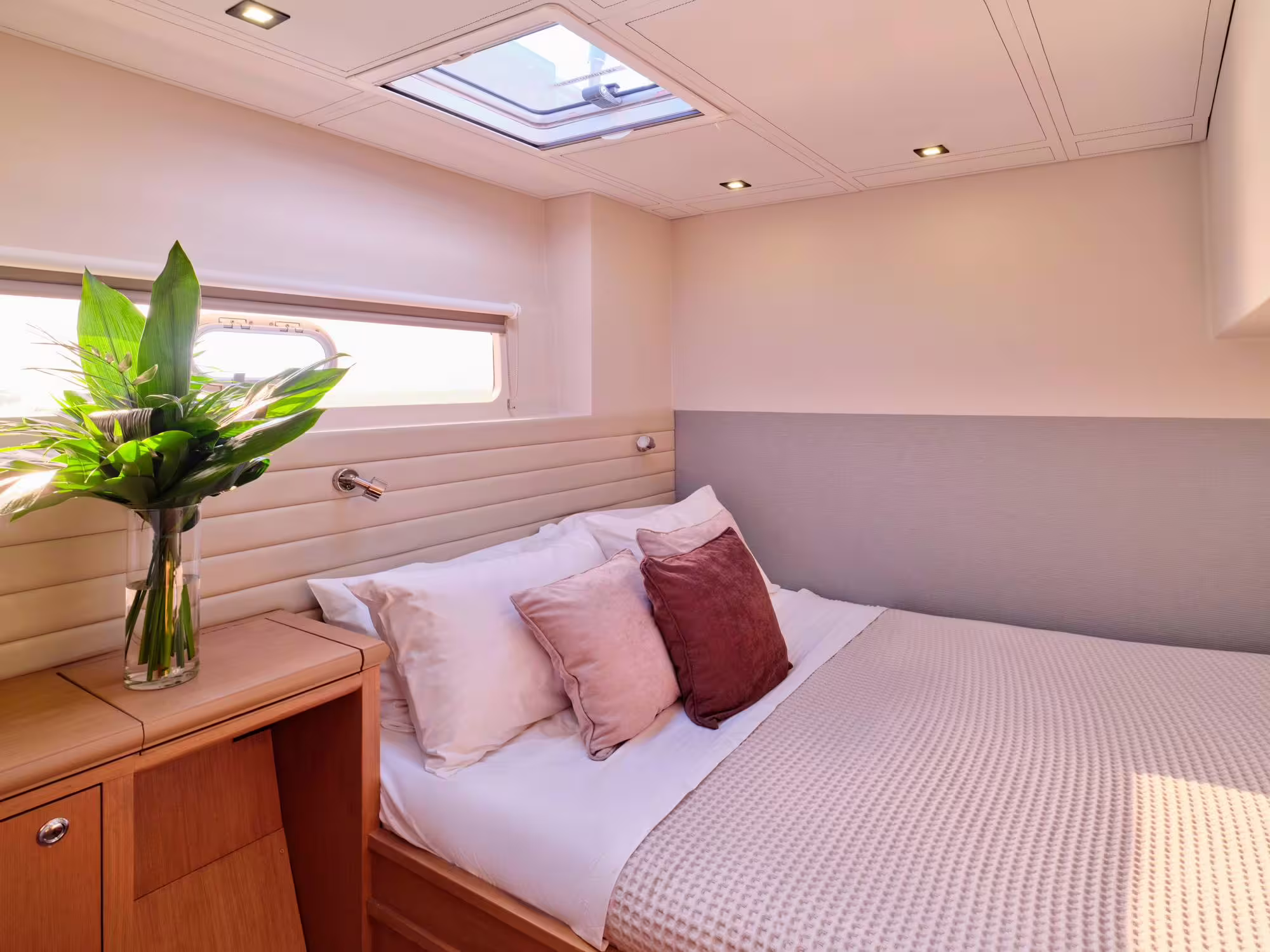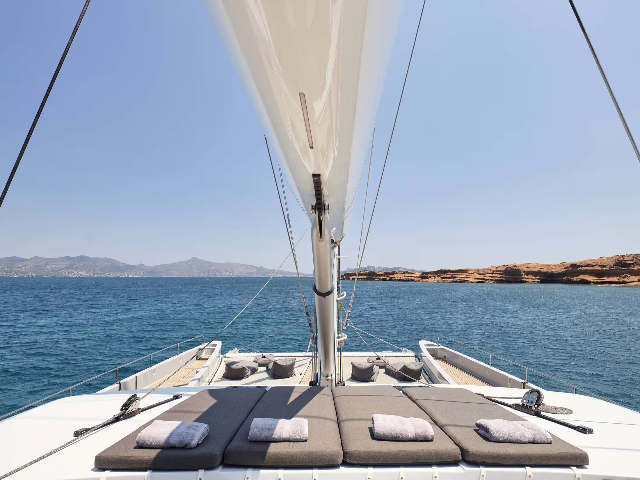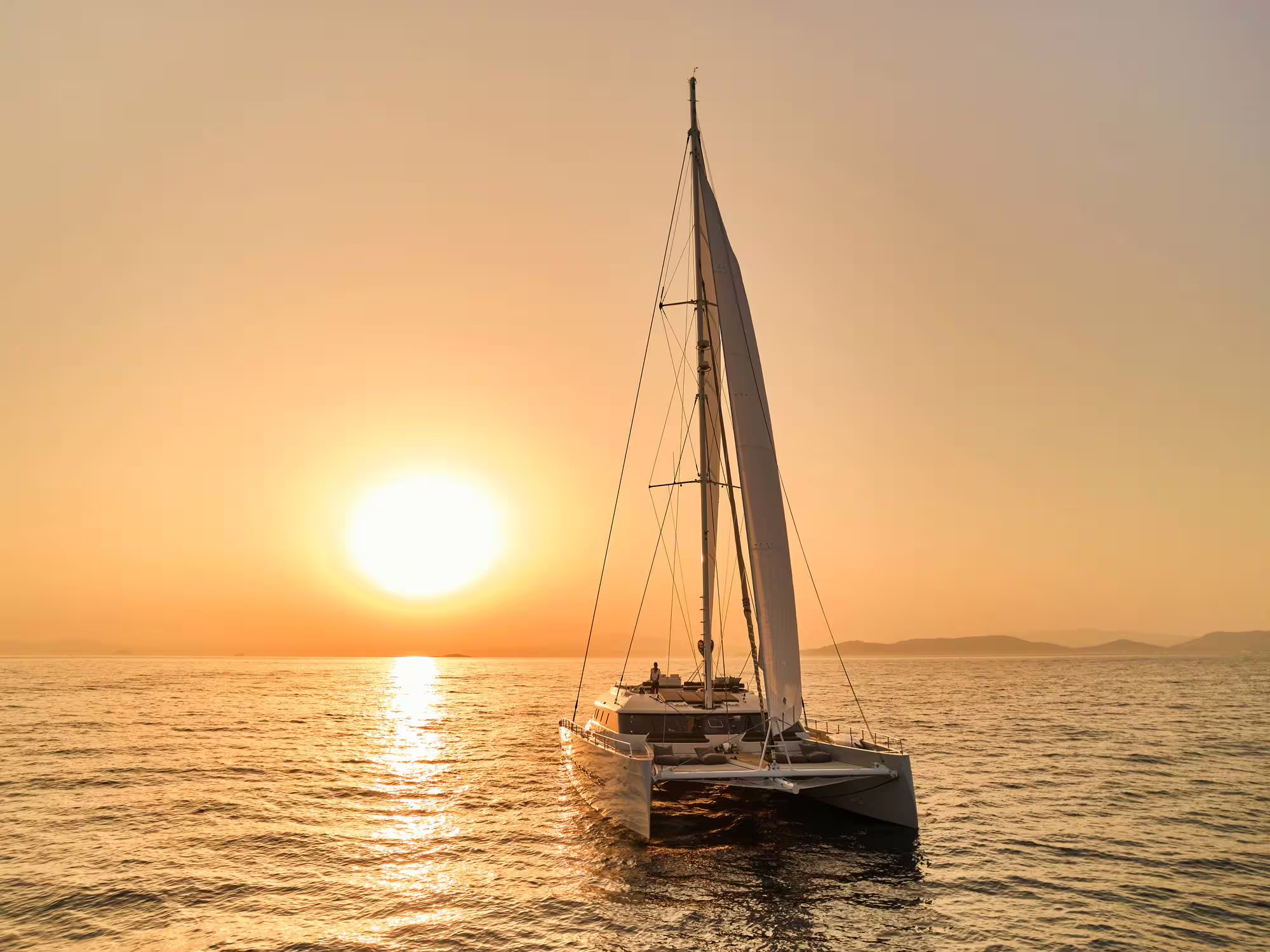 SAMELI, a 23m Balance / Two Oceans Marine catamaran, is a rare blend of speed and luxury. With a top speed of 25 knots, this flybridge catamaran is designed for those who seek both performance and comfort at sea. Its minimalist, open-plan interiors feature natural wood tones and panoramic sea-level windows, creating a serene atmosphere for up to 10 guests across five luxurious cabins. Perfect for exploring the Greek islands, SAMELI offers a seamless connection to the water, combining fast cruising with refined living. Whether for family adventures or private escapes, this vessel delivers an unforgettable yachting experience with every journey.