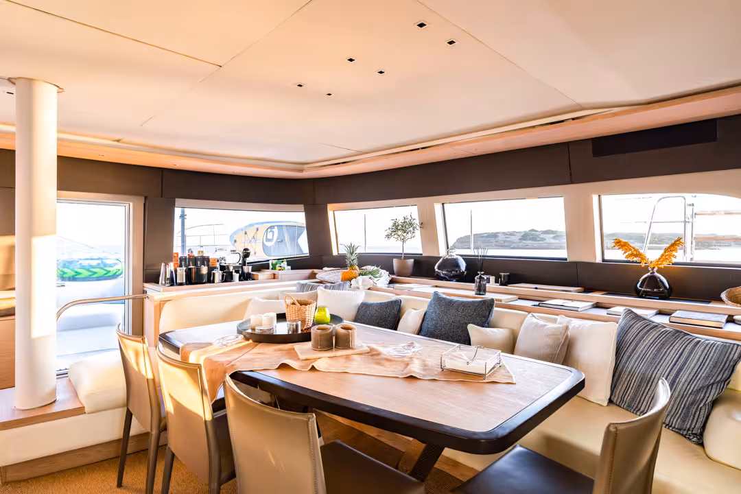 A comfortable catamaran with modern lines and inviting cabins. Comes with an elevated deck and enclosures for wind protection.