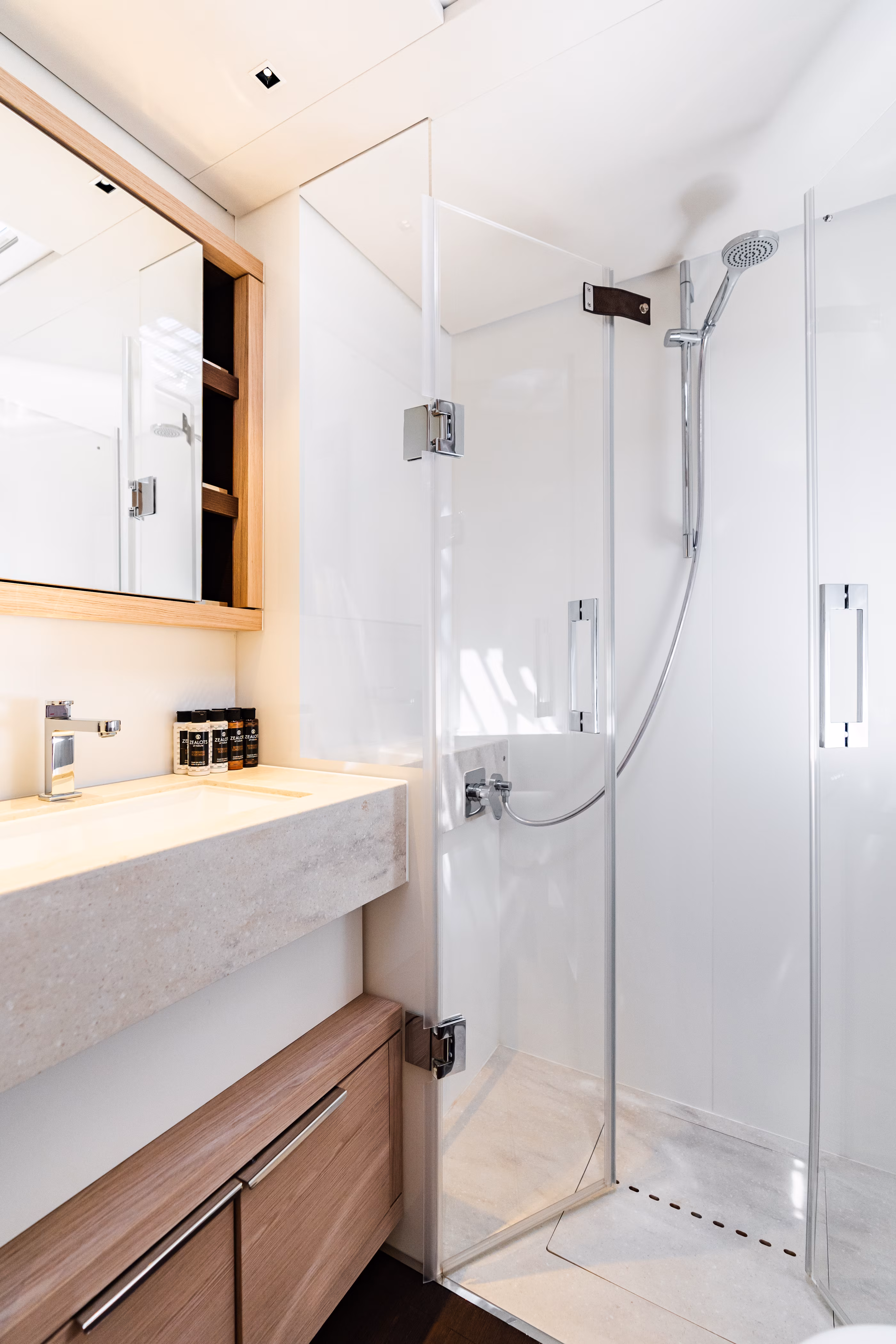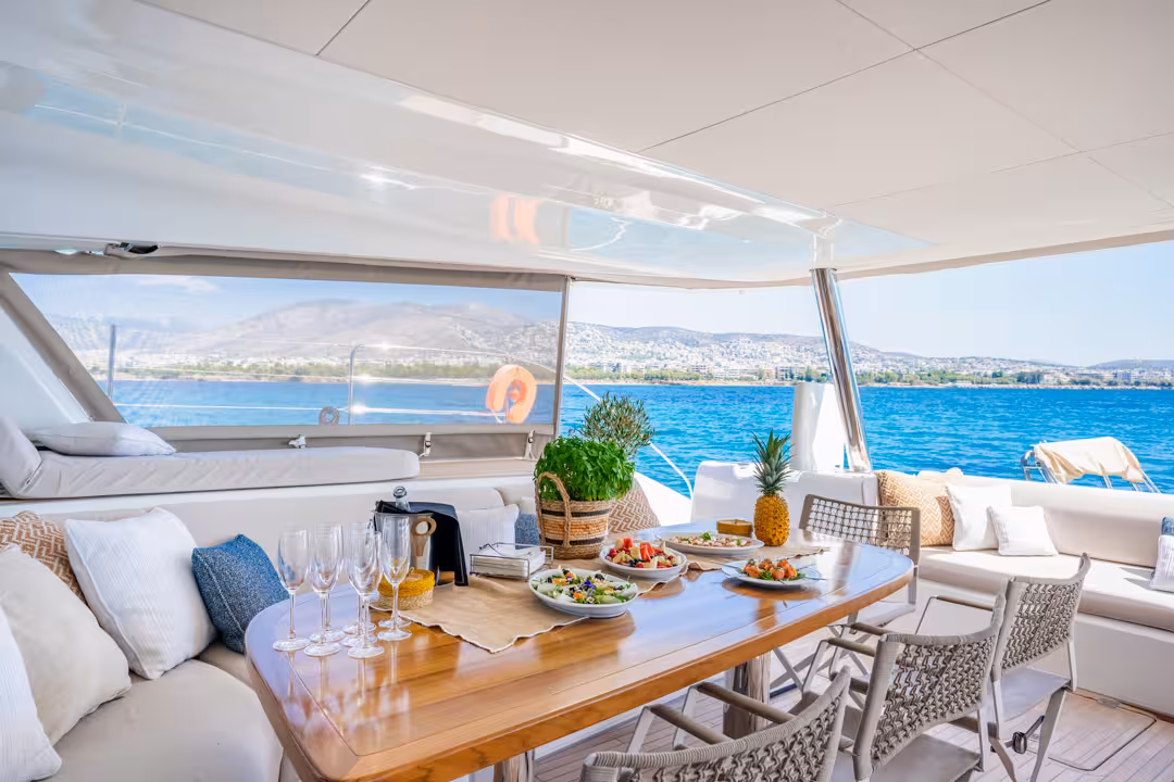 - Flybridge: Helm, Wet bar, seating, panoramic views